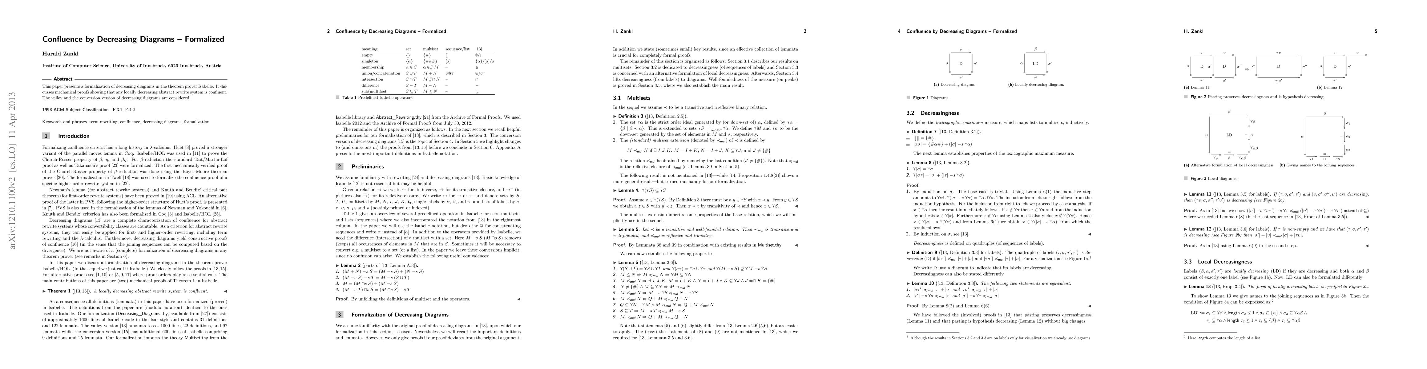 This paper formalizes decreasing diagrams in Isabelle to prove confluence in locally decreasing abstract rewrite systems, considering both valley and conversion versions. The formalization supports mechanical proofs of confluence.