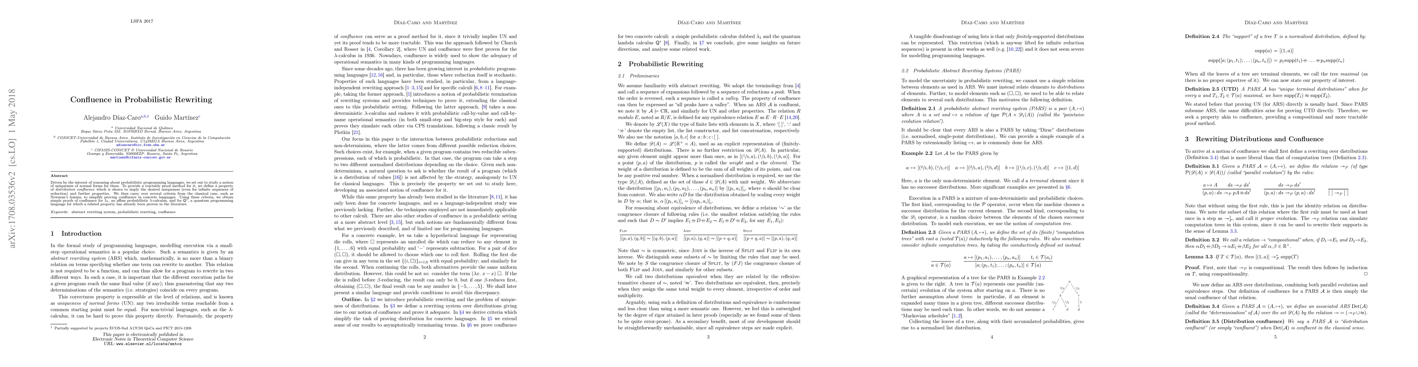 Driven by the interest of reasoning about probabilistic programming languages, we set out to study a notion of unicity of normal forms for them. To provide a tractable proof method for it, we define a property of distribution confluence which is shown to imply the desired uniqueness (even for infinite sequences of reduction) and further properties. We then carry over several criteria from the classical case, such as Newman's lemma, to simplify proving confluence in concrete languages. Using these criteria, we obtain simple proofs of confluence for $\lambda_1$, an affine probabilistic $\lambda$-calculus, and for Q$^*$, a quantum programming language for which a related property has already been proven in the literature.