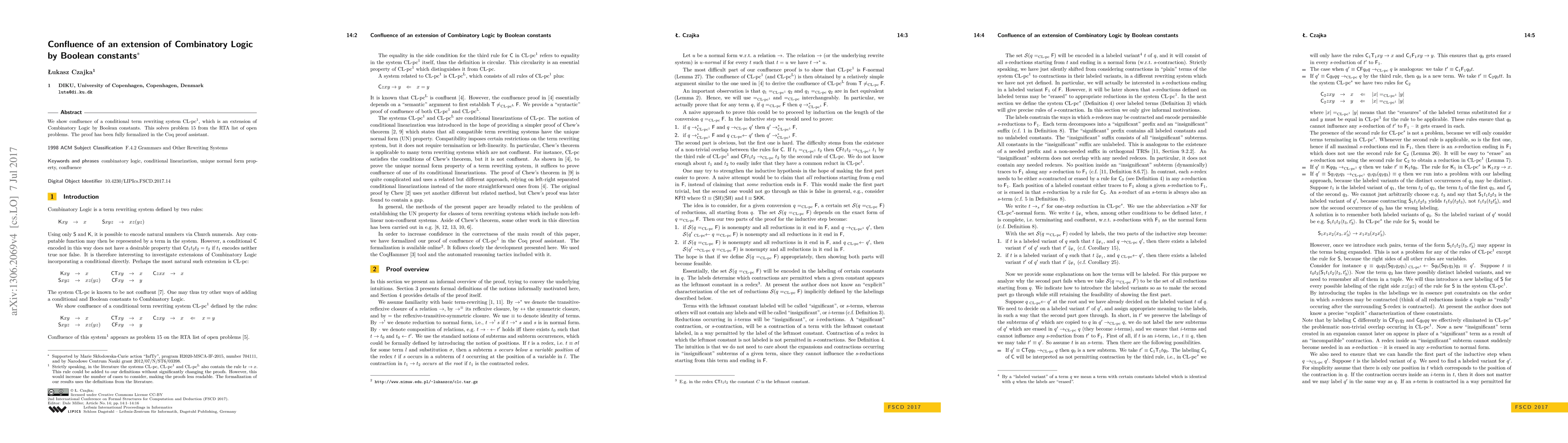The paper demonstrates the confluence property for the extended conditional term rewriting system CL-pc${}^1$, incorporating Boolean constants into Combinatory Logic, thereby resolving problem 15 from the RTA open problems list, with a fully formalized proof in Coq.