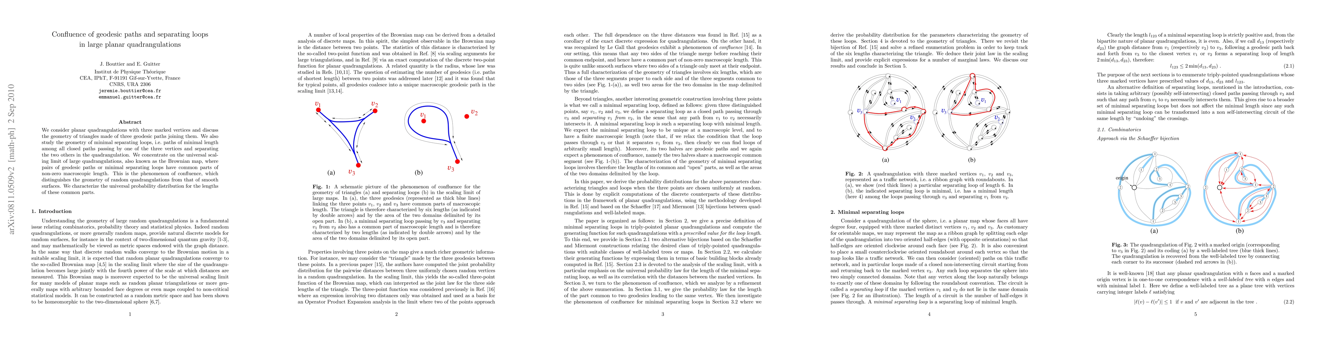 This paper investigates the geometry of geodesic paths and minimal separating loops in large planar quadrangulations, focusing on the phenomenon of confluence where these paths share non-zero macroscopic lengths in the universal scaling limit known as the Brownian map. The study characterizes the probability distribution of the lengths of these common segments.