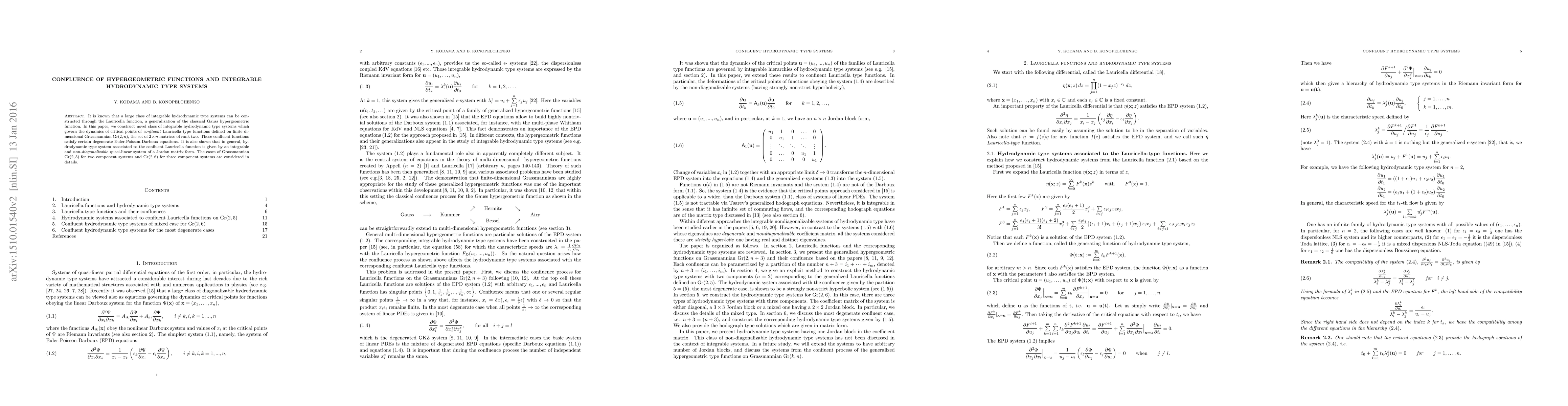 This paper constructs a novel class of integrable hydrodynamic type systems governed by dynamics of critical points of confluent Lauricella type functions on Grassmannian Gr(2,n). It shows these systems follow degenerate Euler-Poisson-Darboux equations and are given by non-diagonalizable quasi-linear systems of Jordan matrix form, with detailed cases for Gr(2,5) and Gr(2,6).