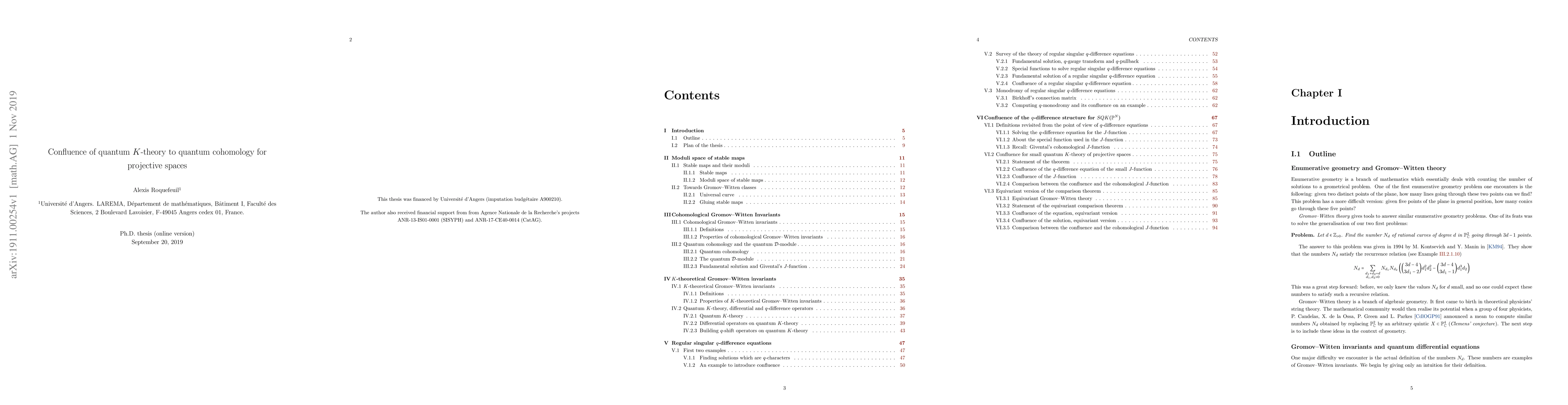 In algebraic geometry, Gromov--Witten invariants are enumerative invariants that count the number of complex curves in a smooth projective variety satisfying some incidence conditions. In 2001, A. Givental and Y.P. Lee defined new invariants, called $K$-theoretical Gromov--Witten invariants. These invariants are obtained by replacing cohomological constructions used in the definition of the usual Gromov--Witten invariants by their $K$-theoretical analogues. Then, an essential question is to understand how these two invariants are related. In 2013, Iritani-Givental-Milanov-Tonita show that $K$-theoretical Gromov--Witten invariants can be embedded in a function which satisfies a $q$-difference equation. In general, these equations verify a property called "confluence", which guarantees that we can take some limit of these functional equations to obtain differential equations. In this thesis, we propose to compare the two Gromov--Witten theories through the confluence of $q$-difference equation. We show that, in the case of complex projective spaces, the confluence of Givental's small $K$-theoretical $J$-function as a solution of a $q$-difference equations outputs its cohomological analogue.