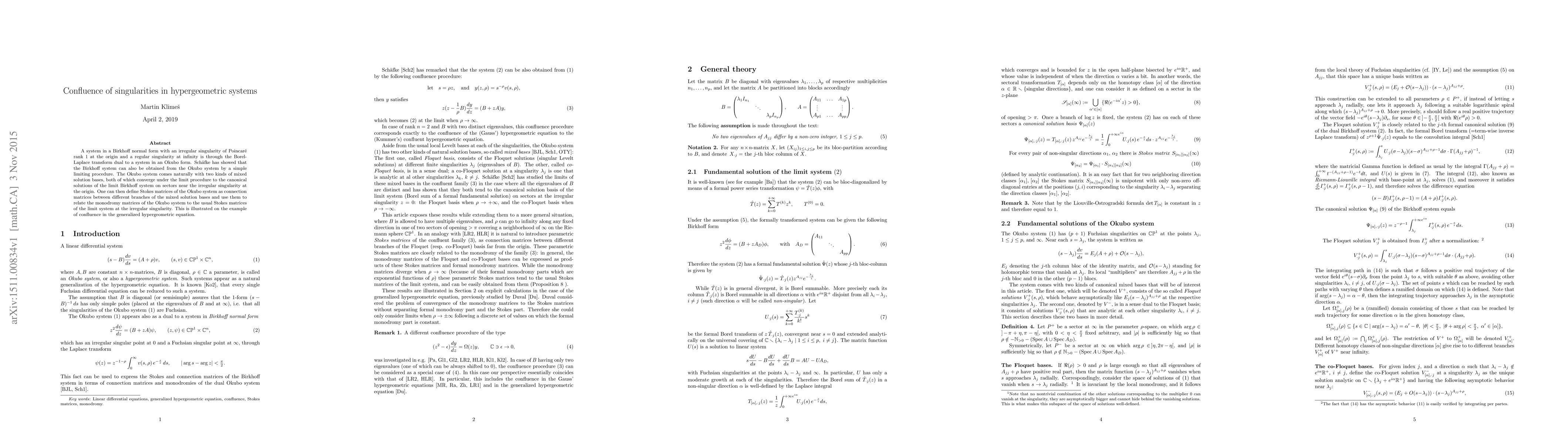 A system in a Birkhoff normal form with an irregular singularity of Poincare rank 1 at the origin and a regular singularity at infinity is through the Borel-Laplace transform dual to a system in an Okubo form. Schafke has showed that the Birkhoff system can also be obtained from the Okubo system by a simple limiting procedure. The Okubo system comes naturally with two kinds of mixed solution bases, both of which converge under the limit procedure to the canonical solutions of the limit Birkhoff system on sectors near the irregular singularity at the origin. One can then define Stokes matrices of the Okubo system as connection matrices between different branches of the mixed solution bases and use them to relate the monodromy matrices of the Okubo system to the usual Stokes matrices of the limit system at the irregular singularity. This is illustrated on the example of confluence in the generalized hypergeometric equation.