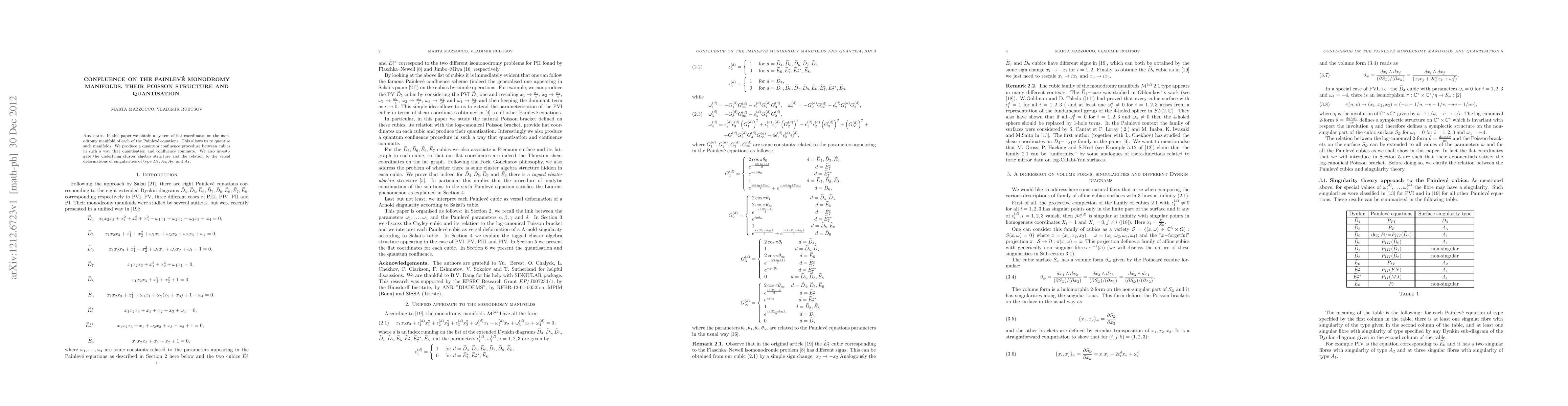 In this paper we obtain a system of flat coordinates on the monodromy manifold of each of the Painlev\'e equations. This allows us to quantise such manifolds. We produce a quantum confluence procedure between cubics in such a way that quantisation and confluence commute. We also investigate the underlying cluster algebra structure and the relation to the versal deformations of singularities of type $D_4,A_3,A_2$, and $A_1$.