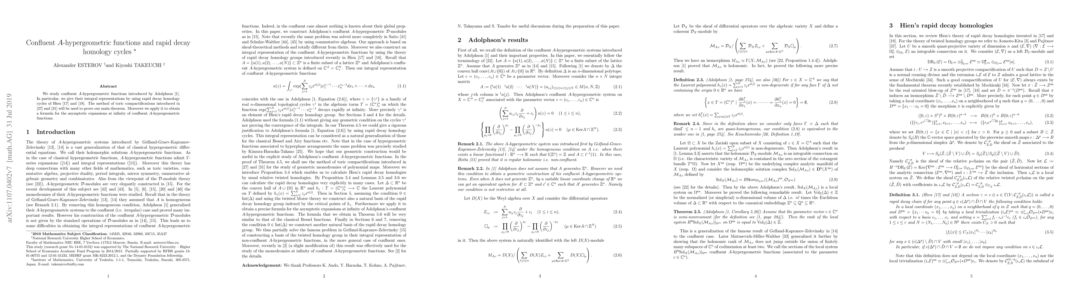 Summary: This paper explores confluent A-hypergeometric functions, providing integral representations via rapid decay homology cycles and deriving asymptotic expansion formulas for these functions at infinity.