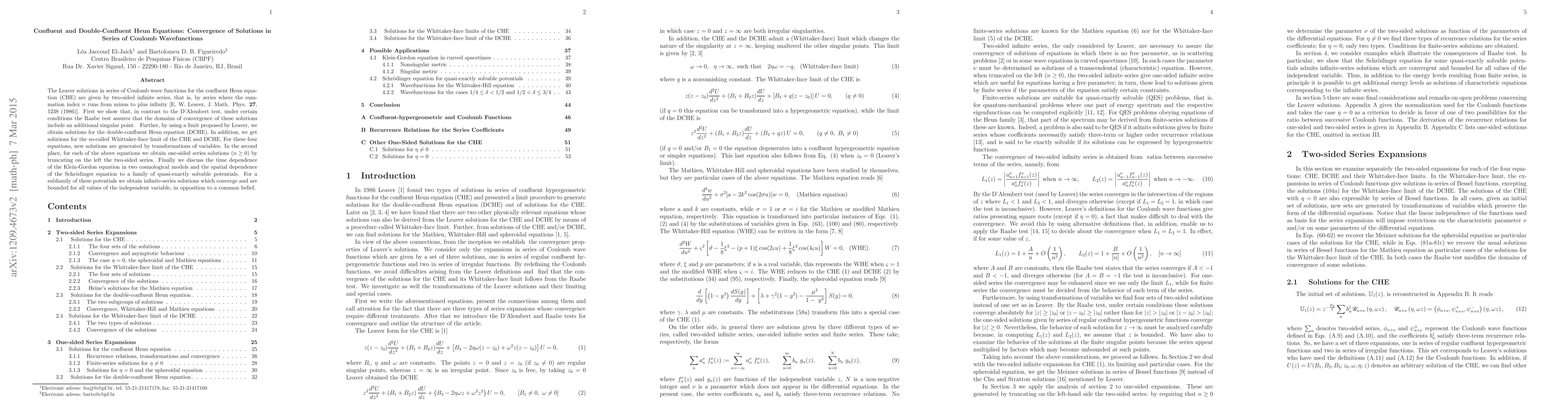 The Leaver solutions in series of Coulomb wave functions for the confluent Heun equation (CHE) are given by two-sided infinite series, that is, by series where the summation index $n$ runs from minus to plus infinity [E. W. Leaver, J. Math. Phys. 27, 1238 (1986)]. First we show that, in contrast to the D'Alembert test, under certain conditions the Raabe test assures that the domains of convergence of these solutions include an additional singular point. Further, by using a limit proposed by Leaver, we obtain solutions for the double-confluent Heun equation (DCHE). In addition, we get solutions for the so-called Whittaker-Ince limit of the CHE and DCHE. For these four equations, new solutions are generated by transformations of variables. In the second place, for each of the above equations we obtain one-sided series solutions ($n\geq 0$) by truncating on the left the two-sided series. Finally we discuss the time dependence of the Klein-Gordon equation in two cosmological models and the spatial dependence of the Schr\"{o}dinger equation to a family of quasi-exactly solvable potentials. For a subfamily of these potentials we obtain infinite-series solutions which converge and are bounded for all values of the independent variable, in opposition to a common belief}.