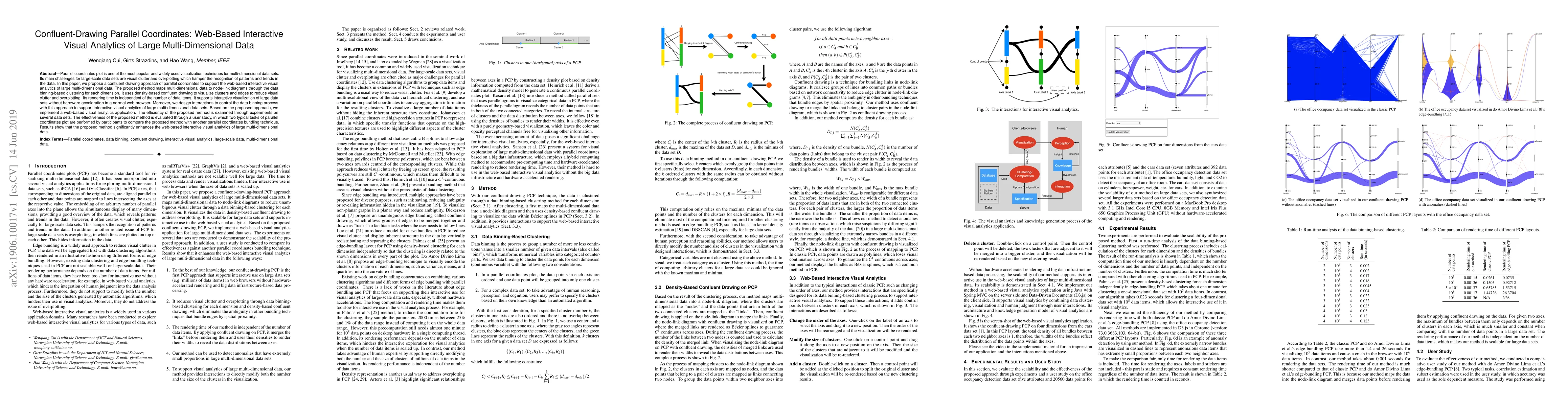 This paper proposes a confluent drawing approach for parallel coordinates to enhance web-based interactive visual analytics of large multi-dimensional data, addressing visual clutter and overplotting through data binning and density-based clustering. The method is evaluated through experiments and user studies, showing significant improvements over existing techniques.