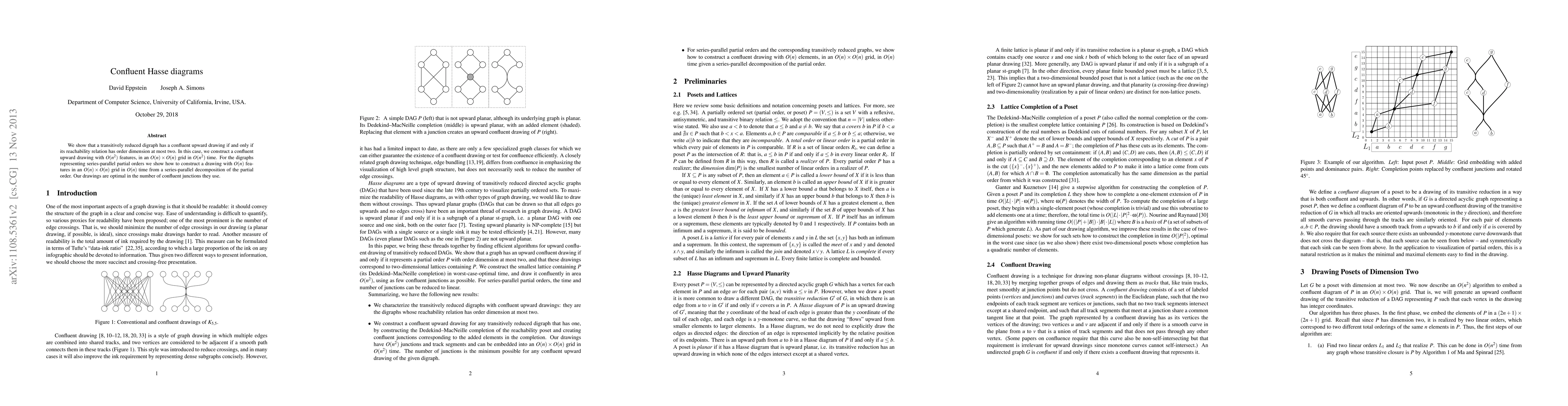 We show that a transitively reduced digraph has a confluent upward drawing if and only if its reachability relation has order dimension at most two. In this case, we construct a confluent upward drawing with $O(n^2)$ features, in an $O(n) \times O(n)$ grid in $O(n^2)$ time. For the digraphs representing series-parallel partial orders we show how to construct a drawing with $O(n)$ features in an $O(n) \times O(n)$ grid in $O(n)$ time from a series-parallel decomposition of the partial order. Our drawings are optimal in the number of confluent junctions they use.