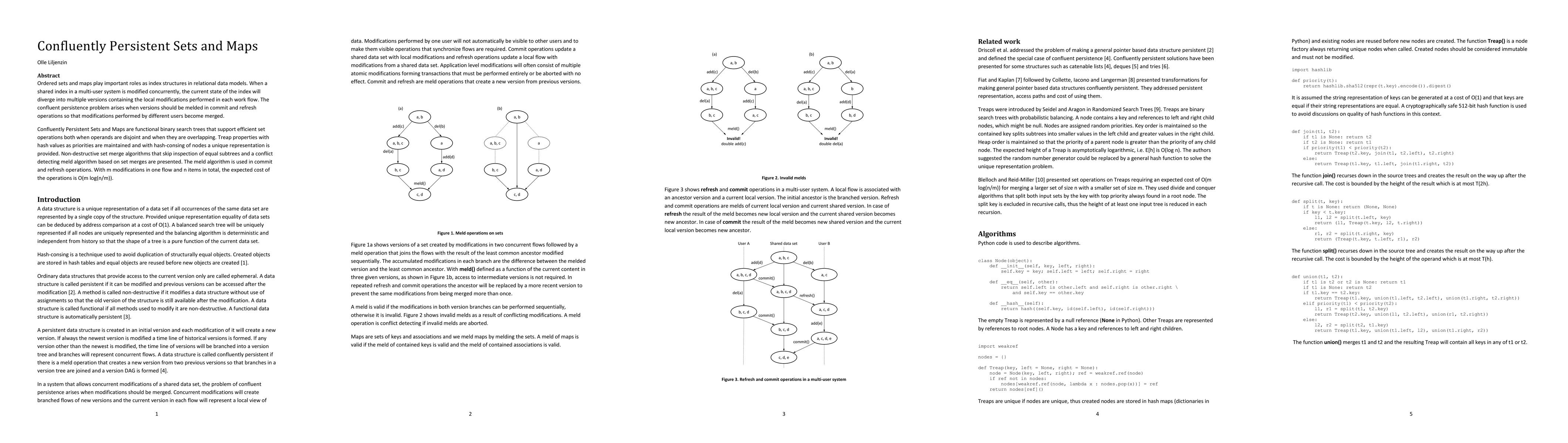 This paper introduces confluently persistent sets and maps, functional binary search trees that efficiently handle concurrent modifications in multi-user systems. It presents non-destructive merge algorithms and a conflict-detecting meld algorithm for merging divergent versions, with an expected cost of O(m log(n/m)) for operations.