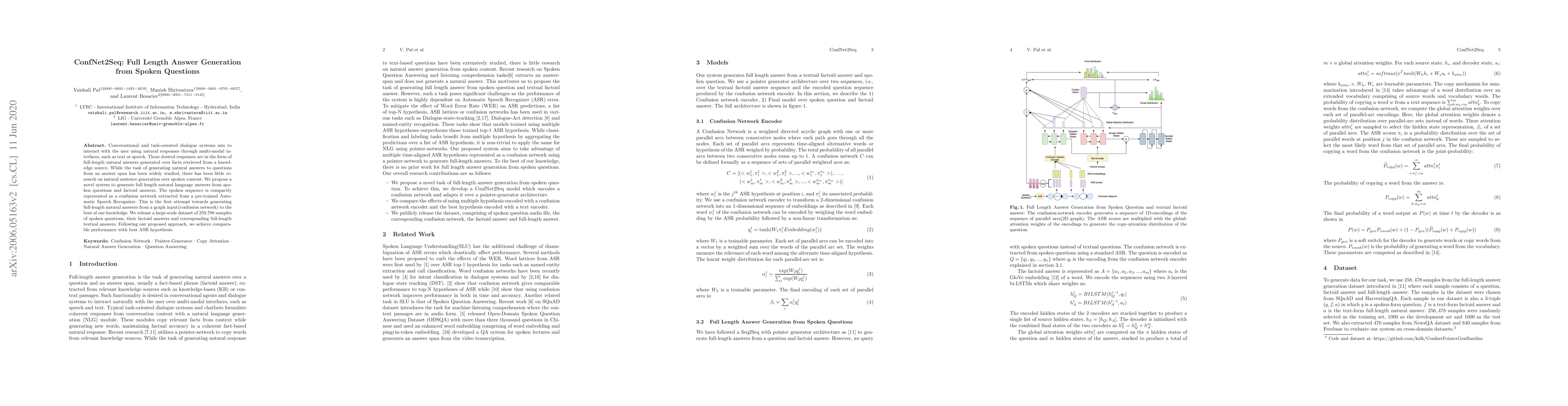 The paper introduces ConfNet2Seq, a system for generating full-length natural answers from spoken questions using a confusion network derived from an Automatic Speech Recognizer. The authors release a large-scale dataset and demonstrate comparable performance to the best Automatic Speech Recognition hypotheses.