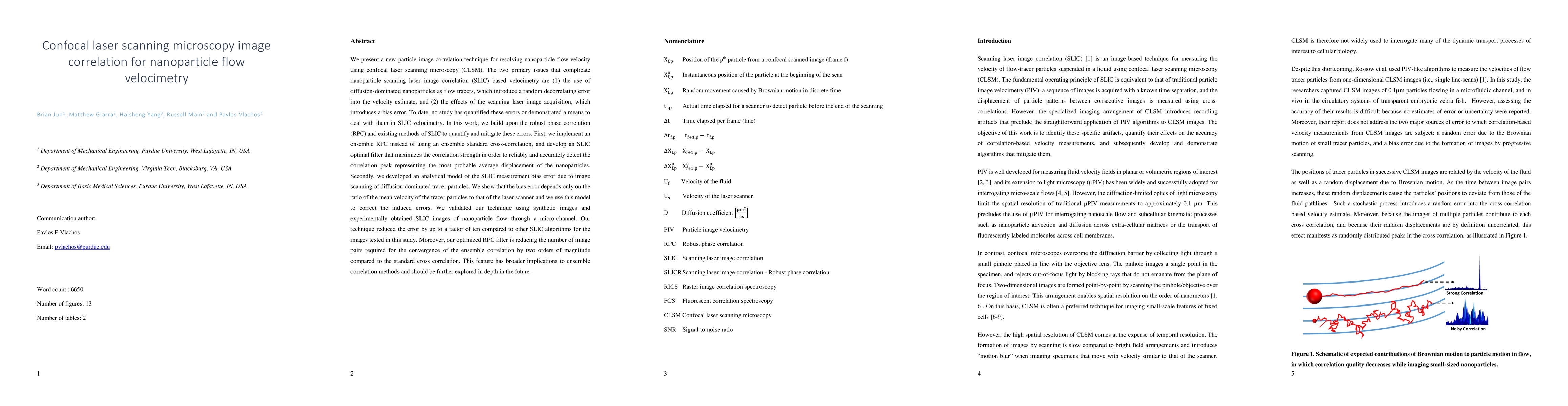 This paper introduces a novel particle image correlation technique for nanoparticle flow velocimetry using confocal laser scanning microscopy (CLSM). It addresses the random and bias errors in scanning laser image correlation (SLIC) by implementing an ensemble robust phase correlation and developing an optimal filter, significantly reducing errors and improving accuracy.
