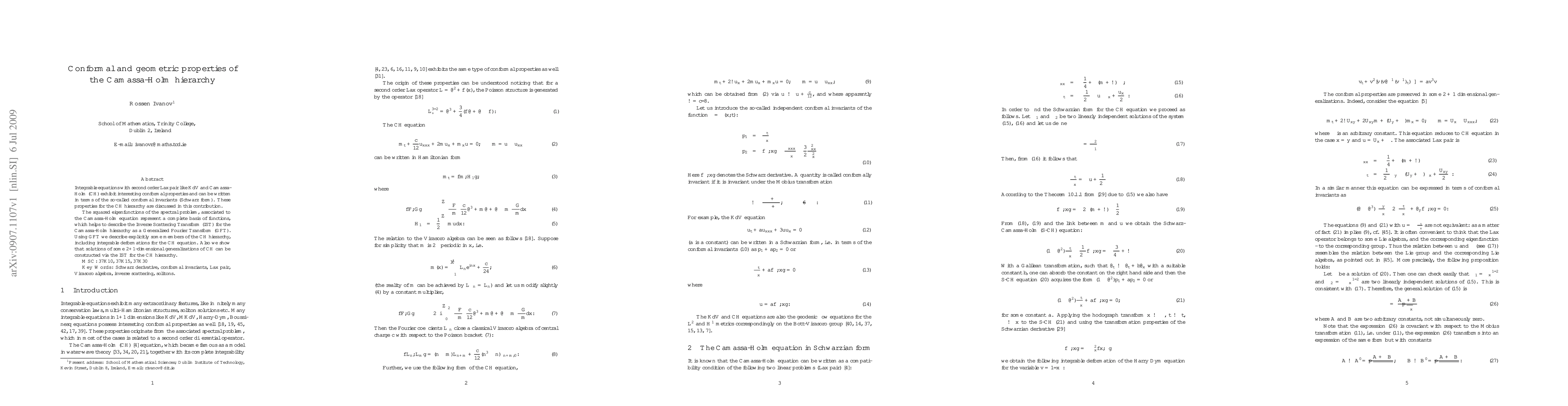 Integrable equations with second order Lax pair like KdV and Camassa-Holm (CH) exhibit interesting conformal properties and can be written in terms of the so-called conformal invariants (Schwarz form). These properties for the CH hierarchy are discussed in this contribution. The squared eigenfunctions of the spectral problem, associated to the Camassa-Holm equation represent a complete basis of functions, which helps to describe the Inverse Scattering Transform (IST) for the Camassa-Holm hierarchy as a Generalised Fourier Transform (GFT). Using GFT we describe explicitly some members of the CH hierarchy, including integrable deformations for the CH equation. Also we show that solutions of some 2+1-dimensional generalizations of CH can be constructed via the IST for the CH hierarchy.