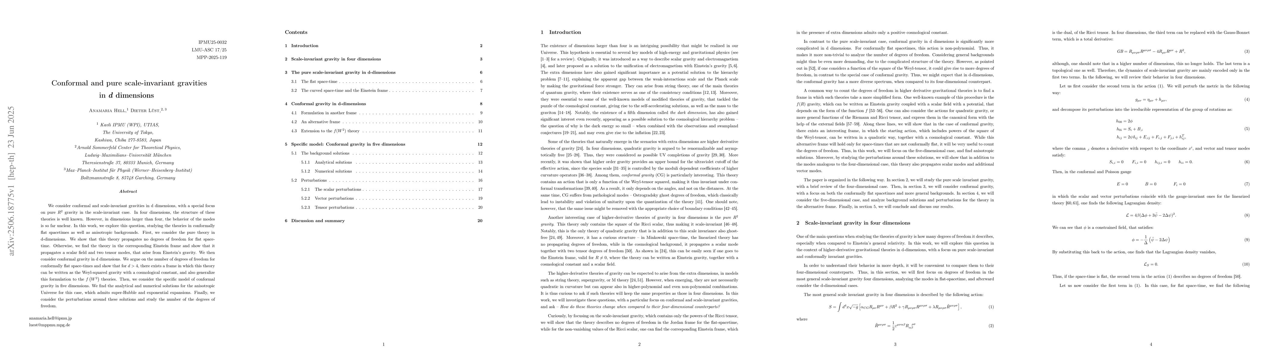 We consider conformal and scale-invariant gravities in d dimensions, with a special focus on pure $R^2$ gravity in the scale-invariant case. In four dimensions, the structure of these theories is well known. However, in dimensions larger than four, the behavior of the modes is so far unclear. In this work, we explore this question, studying the theories in conformally flat spacetimes as well as anisotropic backgrounds. First, we consider the pure theory in d-dimensions. We show that this theory propagates no degrees of freedom for flat space-time. Otherwise, we find the theory in the corresponding Einstein frame and show that it propagates a scalar field and two tensor modes, that arise from Einstein's gravity. We then consider conformal gravity in d dimensions. We argue on the number of degrees of freedom for conformally flat space-times and show that for $d>4$, there exists a frame in which this theory can be written as the Weyl-squared gravity with a cosmological constant, and also generalize this formulation to the $f\left(W^2\right)$ theories. Then, we consider the specific model of conformal gravity in five dimensions. We find the analytical and numerical solutions for the anisotropic Universe for this case, which admits super-Hubble and exponential expansions. Finally, we consider the perturbations around these solutions and study the number of the degrees of freedom.