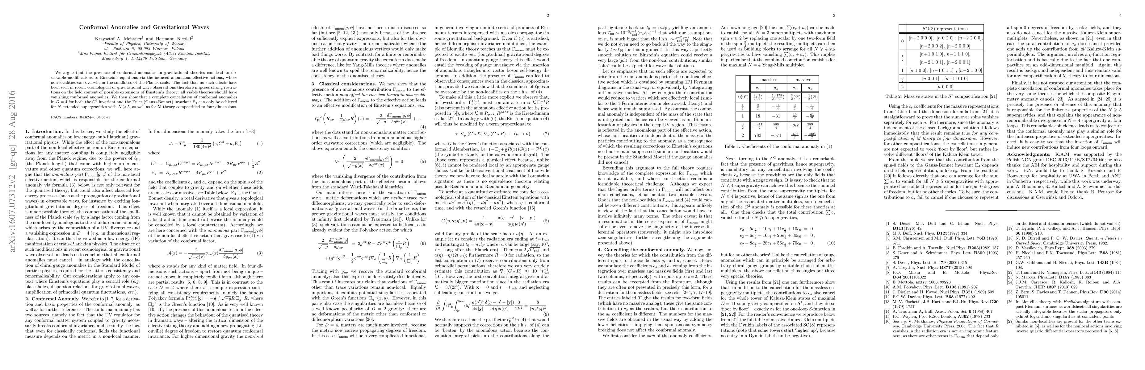 This paper argues that conformal anomalies in gravitational theories could modify Einstein's equations through anomalous effective actions, but recent observations of gravitational waves have not detected such effects, thus imposing strong constraints on the field content of extended theories. It shows that complete cancellation of these anomalies in four dimensions can only occur in N-extended supergravities with N ≥ 5 or in M theory compactified to four dimensions.