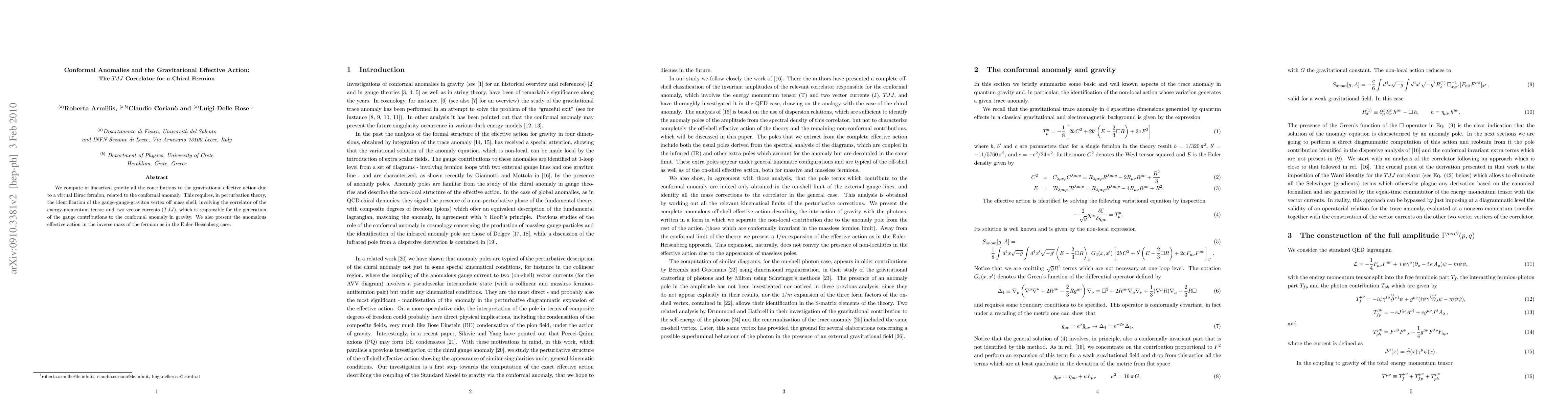 We compute in linearized gravity all the contributions to the gravitational effective action due to a virtual Dirac fermion, related to the conformal anomaly. This requires, in perturbation theory, the identification of the gauge-gauge-graviton vertex off mass shell, involving the correlator of the energy-momentum tensor and two vector currents ($TJJ$), which is responsible for the generation of the gauge contributions to the conformal anomaly in gravity. We also present the anomalous effective action in the inverse mass of the fermion as in the Euler-Heisenberg case.