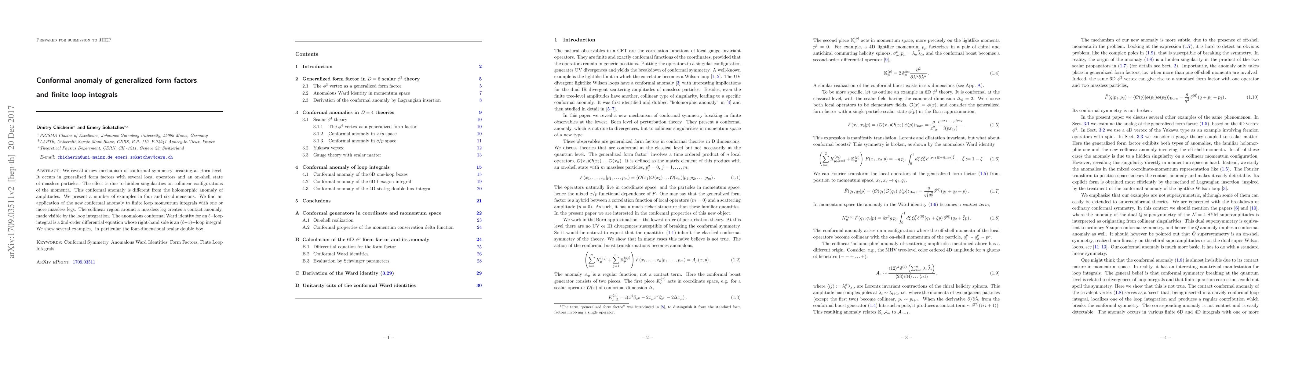 We reveal a new mechanism of conformal symmetry breaking at Born level. It occurs in generalized form factors with several local operators and an on-shell state of massless particles. The effect is due to hidden singularities on collinear configurations of the momenta. This conformal anomaly is different from the holomorphic anomaly of amplitudes. We present a number of examples in four and six dimensions. We find an application of the new conformal anomaly to finite loop momentum integrals with one or more massless legs. The collinear region around a massless leg creates a contact anomaly, made visible by the loop integration. The anomalous conformal Ward identity for an $\ell-$loop integral is a 2nd-order differential equation whose right-hand side is an $(\ell-1)-$loop integral. We show several examples, in particular the four-dimensional scalar double box.