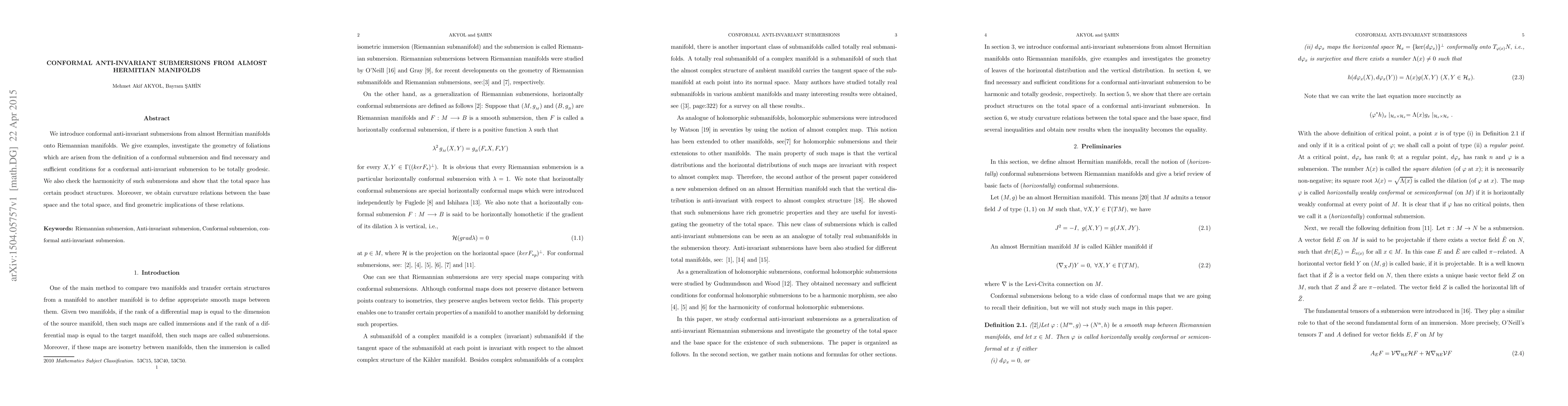 This paper studies conformal anti-invariant submersions from almost Hermitian manifolds to Riemannian manifolds, providing examples and investigating their geometric implications, including the conditions for total geodesicity, harmonicity, and product structures, alongside curvature relations between the base and total spaces.