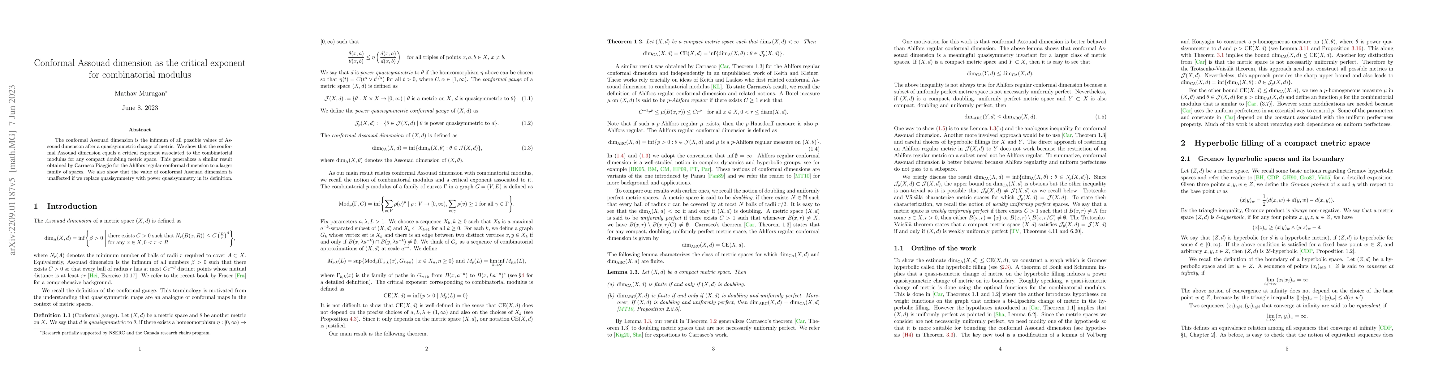 This paper demonstrates that the conformal Assouad dimension, which measures the infimum of Assouad dimensions under quasisymmetric metric changes, equals the critical exponent for combinatorial modulus in compact doubling metric spaces. This extends a prior result for Ahlfors regular spaces to a broader class of spaces.