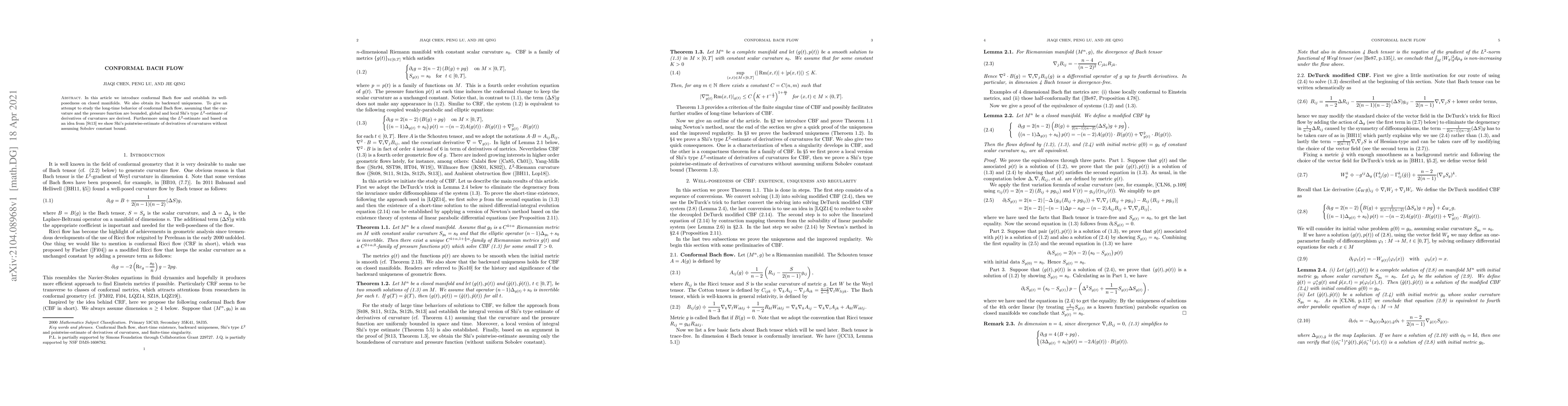 This paper introduces conformal Bach flow on closed manifolds, establishing its well-posedness and backward uniqueness, while also deriving global and local estimates of derivatives of curvatures under certain assumptions.