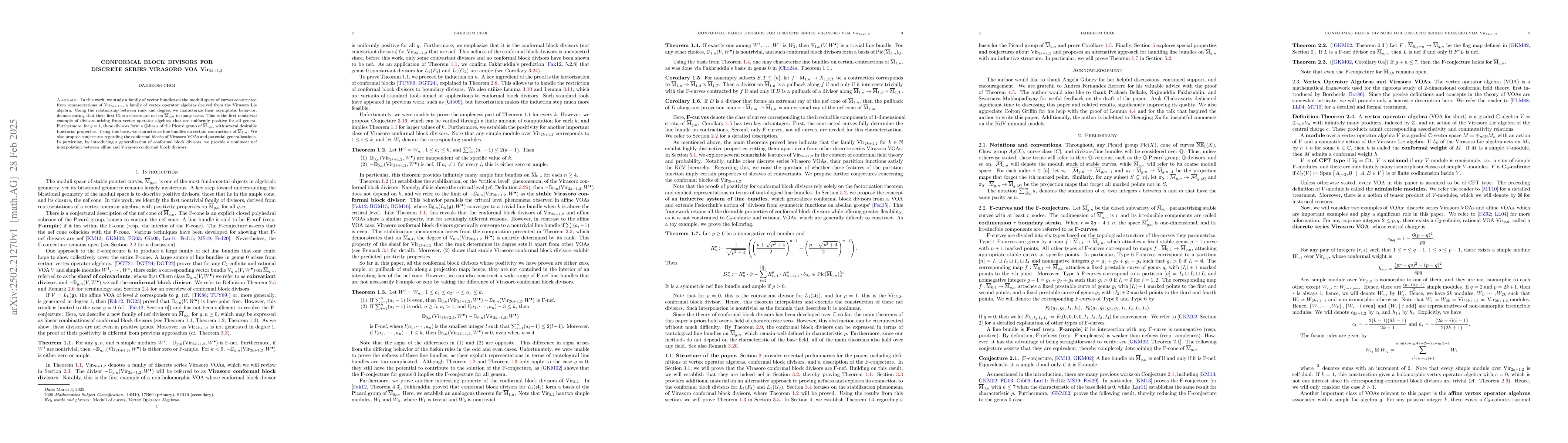 The paper introduces a novel approach to studying vector bundles on moduli spaces using representations of Virasoro vertex operator algebras, characterizing their asymptotic behavior and nef properties, and proposing generalizations of conformal block divisors.