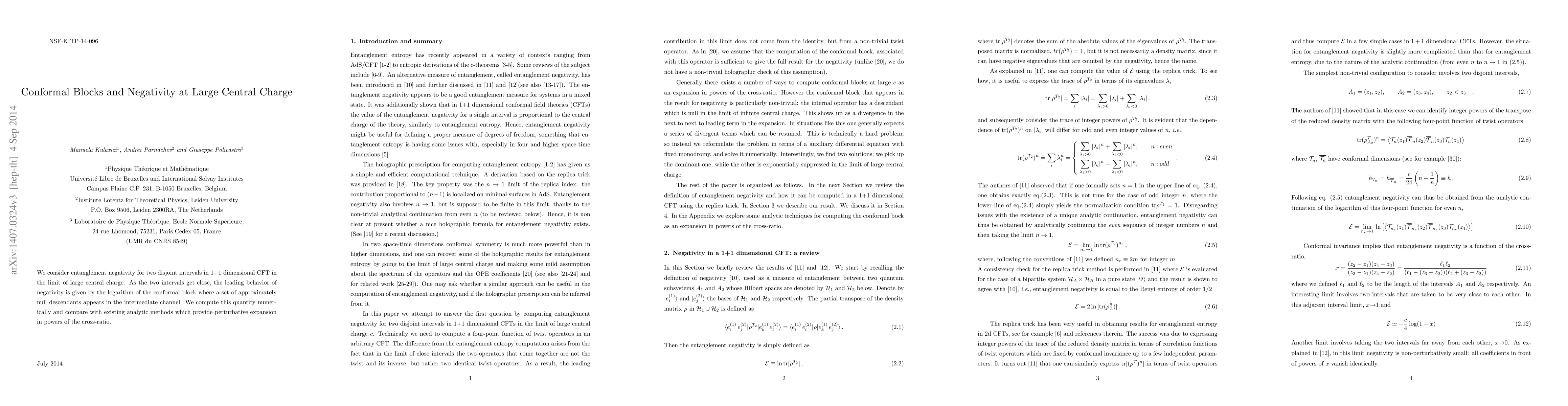 This paper investigates entanglement negativity in 1+1 dimensional CFTs at large central charge, finding that the leading behavior near closely spaced intervals is logarithmically determined by conformal blocks with null descendants. Numerical computations are compared with perturbative analytic methods.