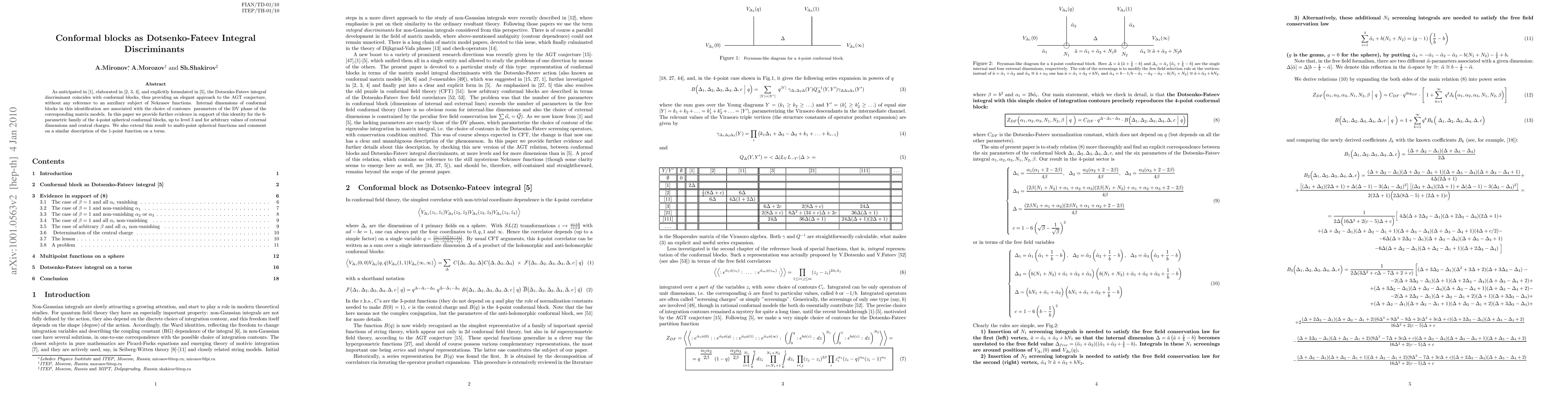 As anticipated in [1], elaborated in [2-4], and explicitly formulated in [5], the Dotsenko-Fateev integral discriminant coincides with conformal blocks, thus providing an elegant approach to the AGT conjecture, without any reference to an auxiliary subject of Nekrasov functions. Internal dimensions of conformal blocks in this identification are associated with the choice of contours: parameters of the DV phase of the corresponding matrix models. In this paper we provide further evidence in support of this identity for the 6-parametric family of the 4-point spherical conformal blocks, up to level 3 and for arbitrary values of external dimensions and central charges. We also extend this result to multi-point spherical functions and comment on a similar description of the 1-point function on a torus.
