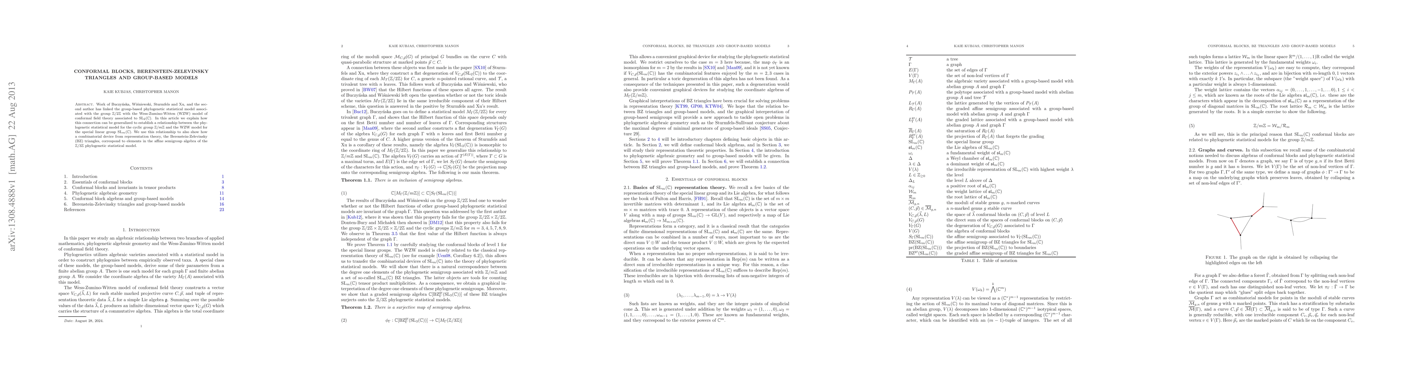 This paper generalizes the connection between group-based phylogenetic models and conformal field theory, linking the Z/mZ model to the WZW model for SL(m,C). It also demonstrates how Berenstein-Zelevinsky triangles relate to the affine semigroup algebra of the Z/3Z phylogenetic model.