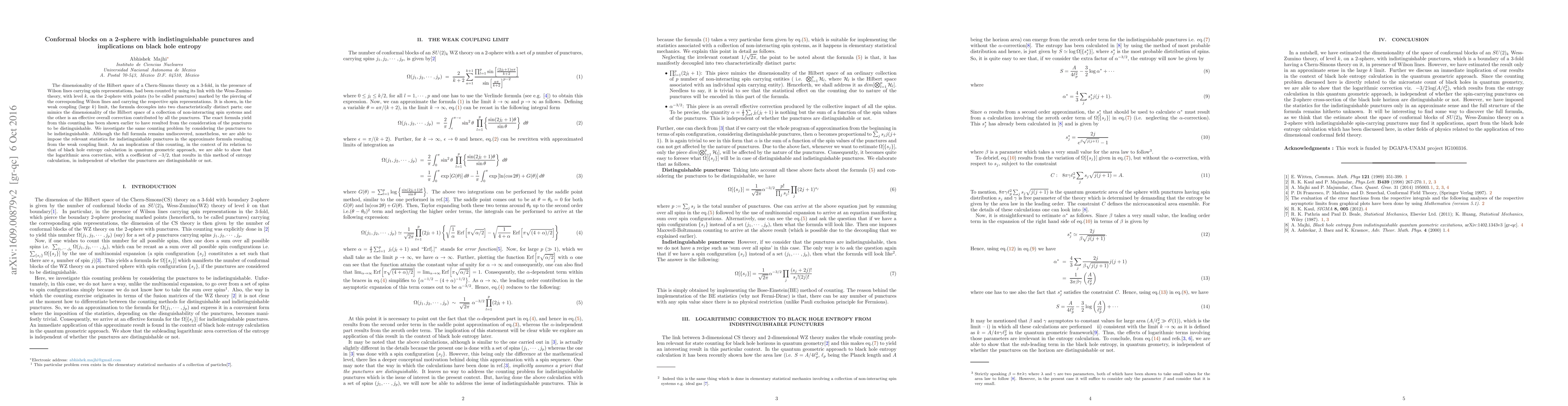 The dimensionality of the Hilbert space of a Chern-Simons theory on a 3-fold, in the presence of Wilson lines carrying spin representations, had been counted by using its link with the Wess-Zumino theory, with level $k$, on the 2-sphere with points (to be called punctures) marked by the piercing of the corresponding Wilson lines and carrying the respective spin representations. It is shown, in the weak coupling (large $k$) limit, the formula decouples into two characteristically distinct parts; one mimics the dimensionality of the Hilbert space of a collection of non-interacting spin systems and the other is an effective overall correction contributed by all the punctures. The exact formula yield from this counting has been shown earlier to have resulted from the consideration of the punctures to be distinguishable. We investigate the same counting problem by considering the punctures to be indistinguishable. Although the full formula remains undiscovered, nonetheless, we are able to impose the relevant statistics for indistinguishable punctures in the approximate formula resulting from the weak coupling limit. As an implication of this counting, in the context of its relation to that of black hole entropy calculation in quantum geometric approach, we are able to show that the logarithmic area correction, with a coefficient of $-3/2$, that results in this method of entropy calculation, in independent of whether the punctures are distinguishable or not.