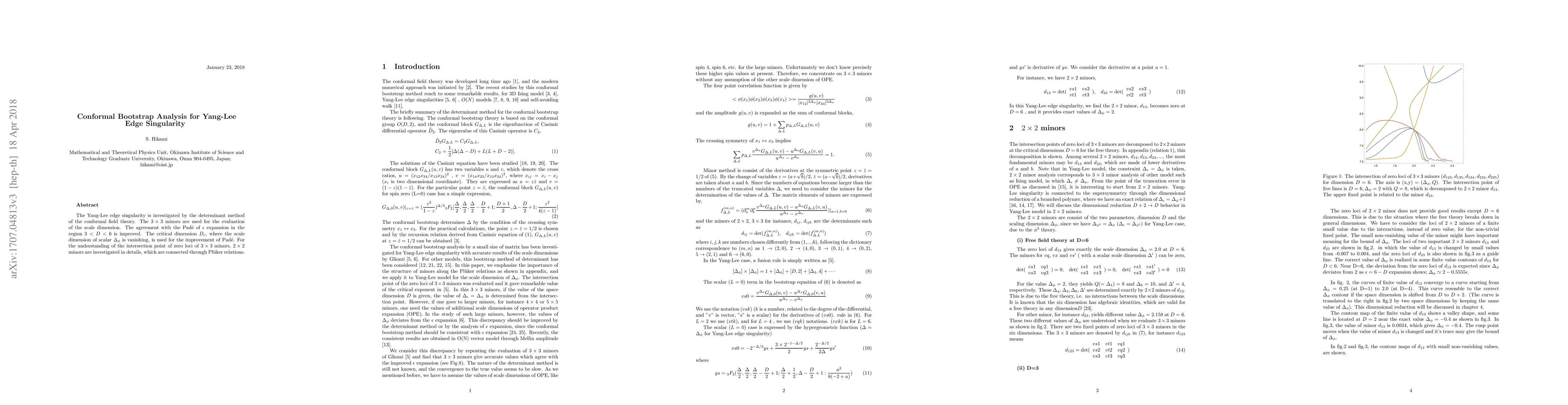 The paper employs conformal bootstrap analysis and the determinant method to study the Yang-Lee edge singularity, determining the critical dimension Dc and estimating the vanishing scale dimension of scalar Delta_phi, with results refined via Pade analysis of the epsilon expansion. The findings suggest Delta_phi ranges between three and six dimensions.