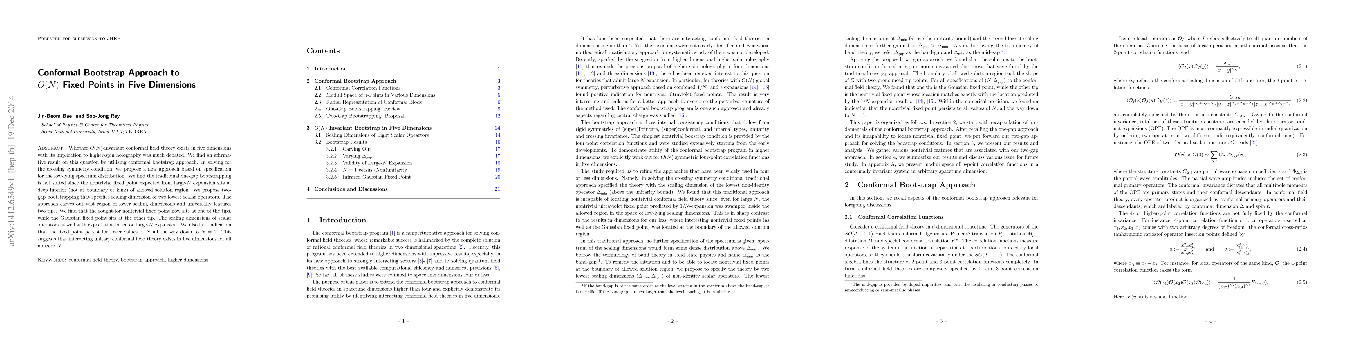 This paper uses conformal bootstrap to confirm that O(N)-invariant conformal field theories exist in five dimensions, proposing a two-gap bootstrapping method to identify a nontrivial fixed point deep within the solution region, rather than at the boundary. The method reveals a persistent fixed point even for small N, suggesting a unitary conformal field theory in five dimensions for all nonzero N.