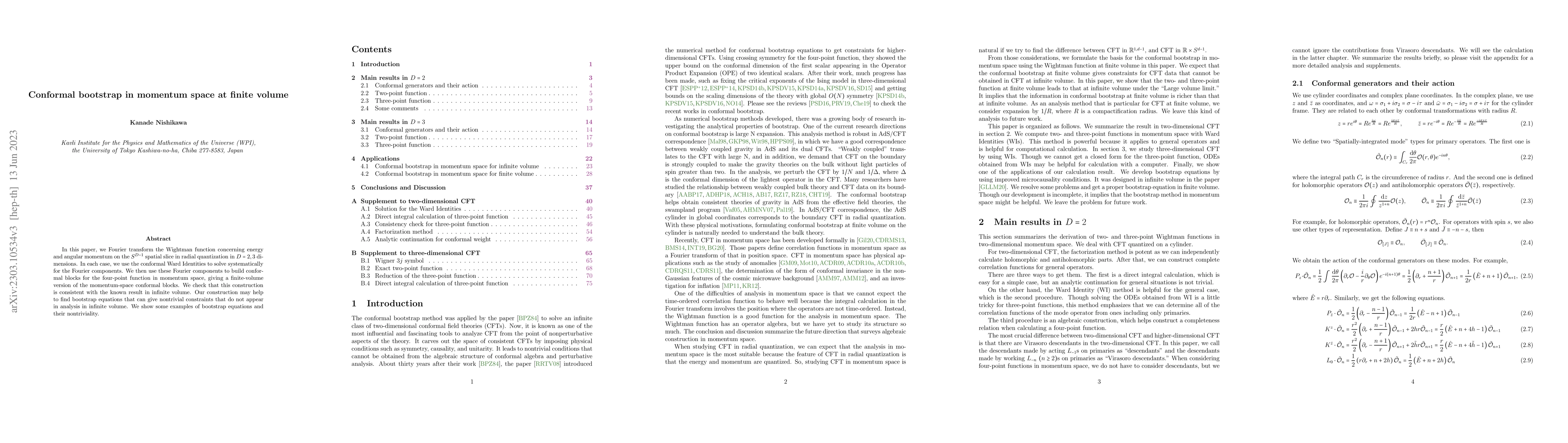 The paper formulates a conformal bootstrap equation in momentum space representation at finite volume for CFTs in D=2,3 dimensions, using Fourier transforms and conformal Ward identities.