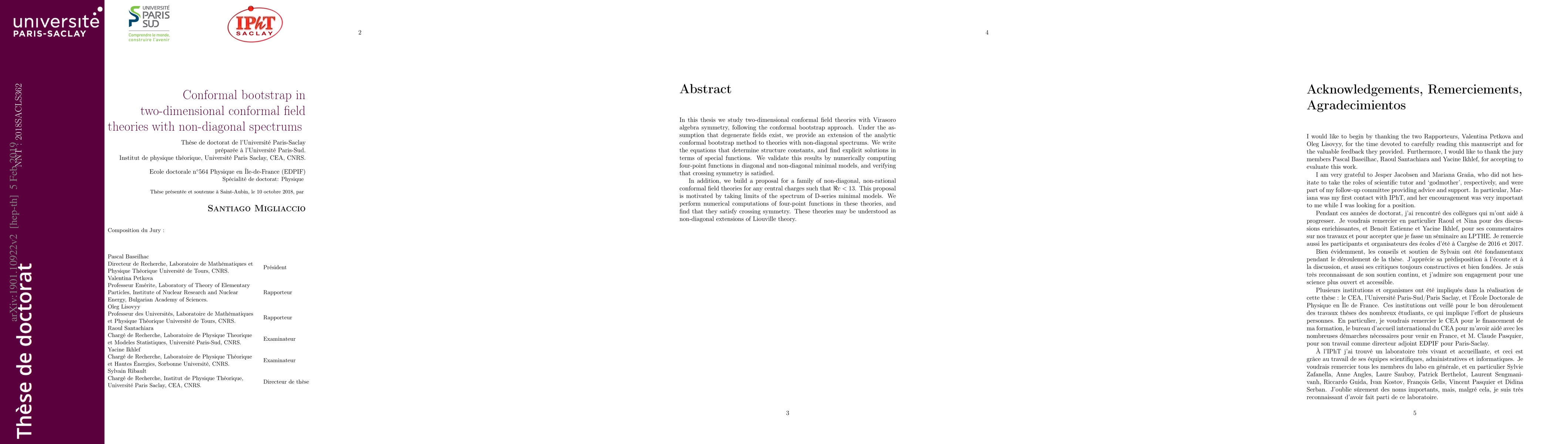 In this thesis we study two-dimensional conformal field theories with Virasoro algebra symmetry, following the conformal bootstrap approach. Under the assumption that degenerate fields exist, we provide an extension of the analytic conformal bootstrap method to theories with non-diagonal spectrums. We write the equations that determine structure constants, and find explicit solutions in terms of special functions. We validate this results by numerically computing four-point functions in diagonal and non-diagonal minimal models, and verifying that crossing symmetry is satisfied. In addition, we build a proposal for a family of non-diagonal, non-rational conformal field theories for any central charges such that $\Re{c} < 13$. This proposal is motivated by taking limits of the spectrum of D-series minimal models. We perform numerical computations of four-point functions in these theories, and find that they satisfy crossing symmetry. These theories may be understood as non-diagonal extensions of Liouville theory.