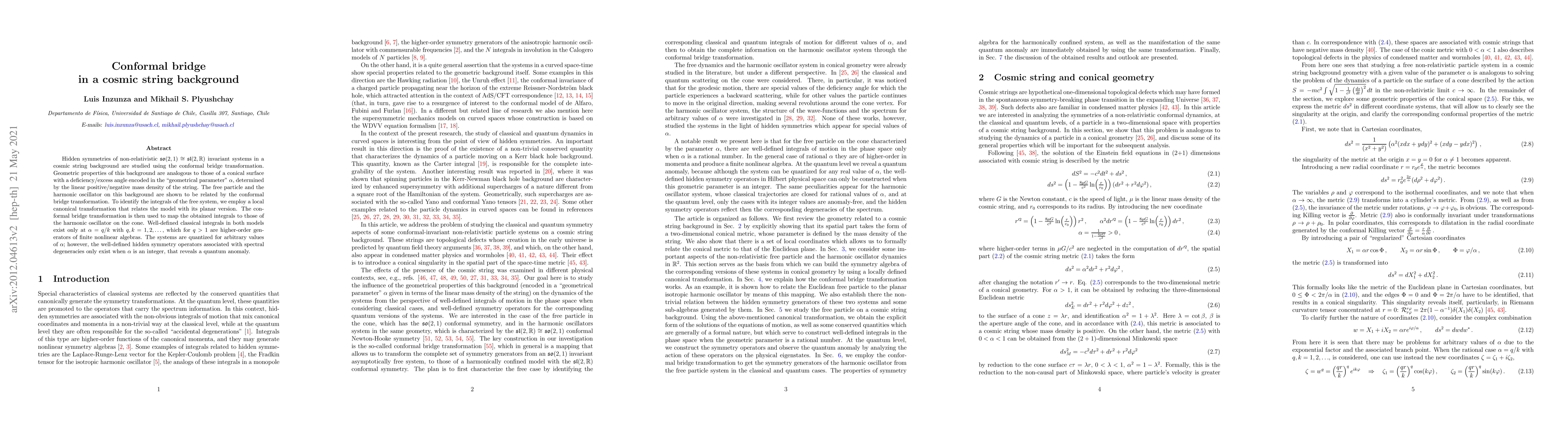 This paper explores hidden symmetries in non-relativistic systems in a cosmic string background using the conformal bridge transformation, showing that the free particle and harmonic oscillator on this background are related. Quantum systems exhibit well-defined hidden symmetry operators only when the geometrical parameter $\alpha$ is an integer, revealing a quantum anomaly.