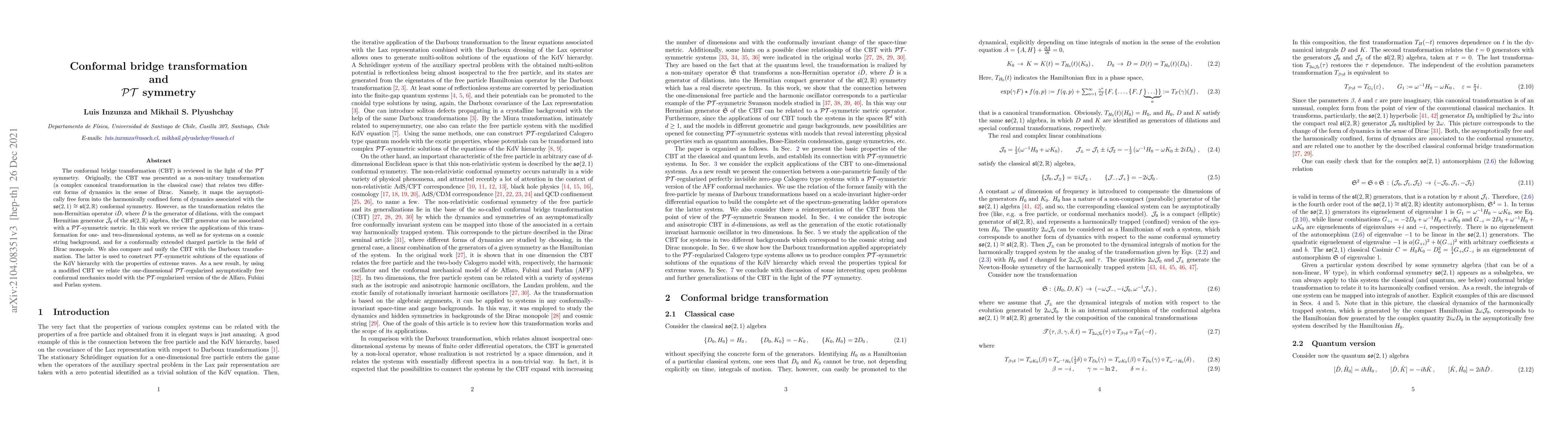 The conformal bridge transformation (CBT) is reviewed in the light of the $\mathcal{PT}$ symmetry. Originally, the CBT was presented as a non-unitary transformation (a complex canonical transformation in the classical case) that relates two different forms of dynamics in the sense of Dirac. Namely, it maps the asymptotically free form into the harmonically confined form of dynamics associated with the $\mathfrak{so}(2,1)\cong \mathfrak{sl}(2,{\mathbb R})$ conformal symmetry. However, as the transformation relates the non-Hermitian operator $i\hat{D}$, where $\hat{D}$ is the generator of dilations, with the compact Hermitian generator $\hat{\mathcal{J}}_0$ of the $\mathfrak{sl}(2,{\mathbb R})$ algebra, the CBT generator can be associated with a $\mathcal{PT}$-symmetric metric. In this work we review the applications of this transformation for one- and two-dimensional systems, as well as for systems on a cosmic string background, and for a conformally extended charged particle in the field of Dirac monopole. We also compare and unify the CBT with the Darboux transformation. The latter is used to construct $\mathcal{PT}$-symmetric solutions of the equations of the KdV hierarchy with the properties of extreme waves. As a new result, by using a modified CBT we relate the one-dimensional $\mathcal{PT}$-regularized asymptotically free conformal mechanics model with the $\mathcal{PT}$-regularized version of the de Alfaro, Fubini and Furlan system.