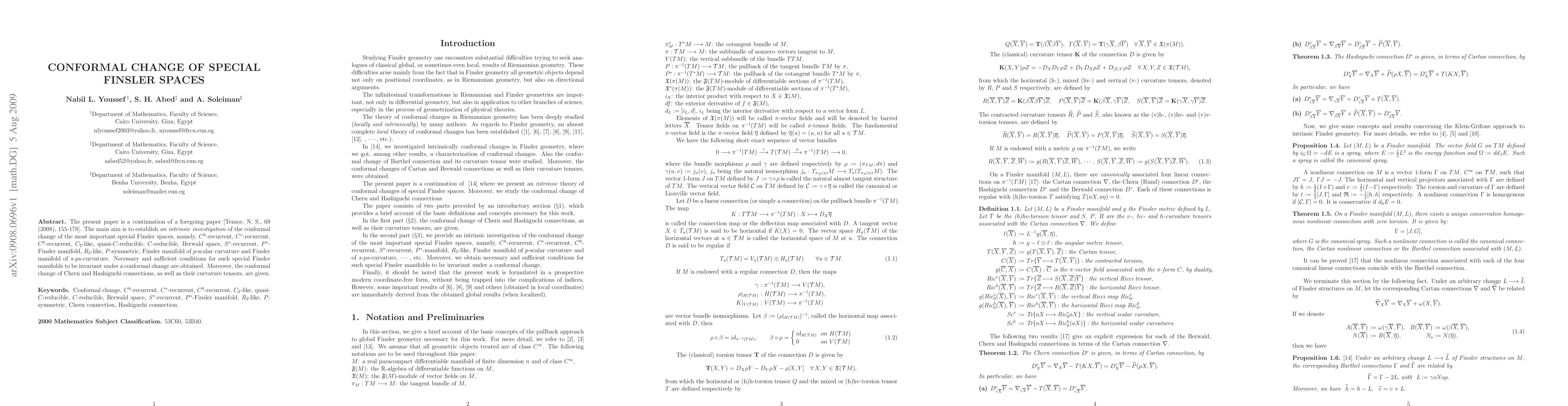 The research methodology involves an intrinsic investigation of the conformal change in special Finsler spaces, including C^{h}-recurrent, C^{v}-recurrent, C^{0}-recurrent, C_{2}-like, quasi-C-reducible, C-reducible, Berwald space, S^{v}-recurrent, P^*-Finsler manifold, R_{3}-like, P-symmetric, Finsler manifold of p-scalar curvature, and Finsler manifold of s-ps-curvature.