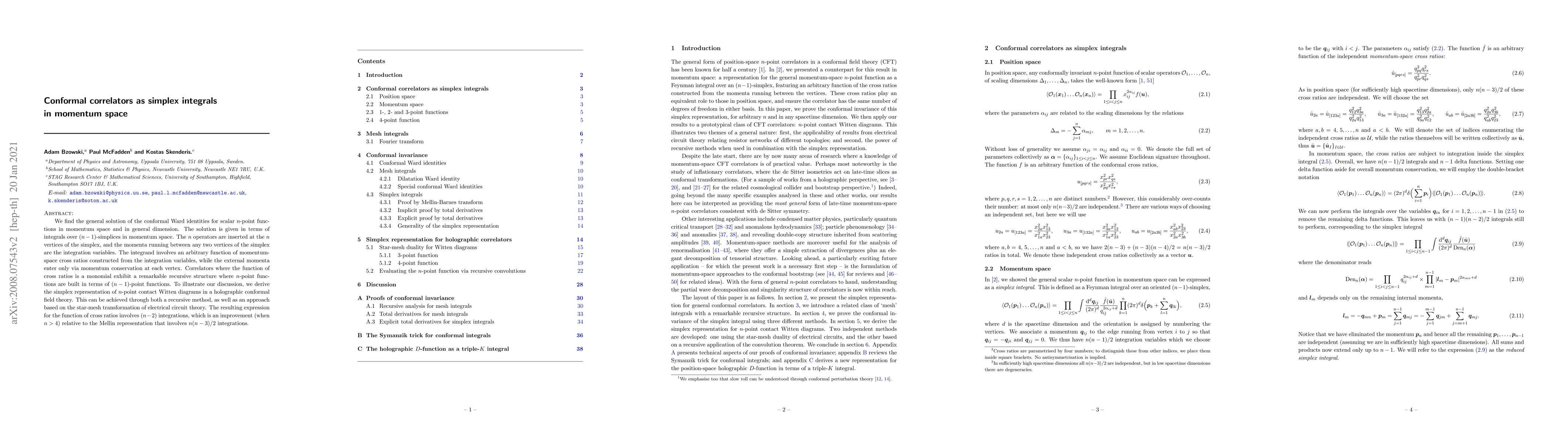 We find the general solution of the conformal Ward identities for scalar $n$-point functions in momentum space and in general dimension. The solution is given in terms of integrals over $(n-1)$-simplices in momentum space. The $n$ operators are inserted at the $n$ vertices of the simplex, and the momenta running between any two vertices of the simplex are the integration variables. The integrand involves an arbitrary function of momentum-space cross ratios constructed from the integration variables, while the external momenta enter only via momentum conservation at each vertex. Correlators where the function of cross ratios is a monomial exhibit a remarkable recursive structure where $n$-point functions are built in terms of $(n-1)$-point functions. To illustrate our discussion, we derive the simplex representation of $n$-point contact Witten diagrams in a holographic conformal field theory. This can be achieved through both a recursive method, as well as an approach based on the star-mesh transformation of electrical circuit theory. The resulting expression for the function of cross ratios involves $(n-2)$ integrations, which is an improvement (when $n>4$) relative to the Mellin representation that involves $n(n-3)/2$ integrations.