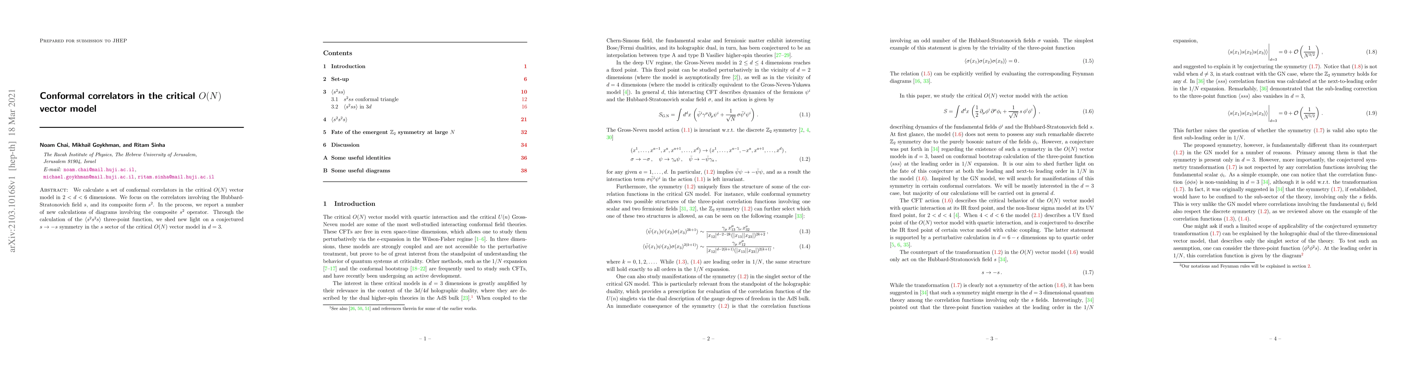 This paper calculates conformal correlators in the critical $O(N)$ vector model across dimensions $2<d<6$, focusing on the Hubbard-Stratonovich field $s$ and its composite form $s^2$. It reveals new insights into a conjectured $s\rightarrow -s$ symmetry through the $\langle s^2s^2s\rangle$ three-point function.
