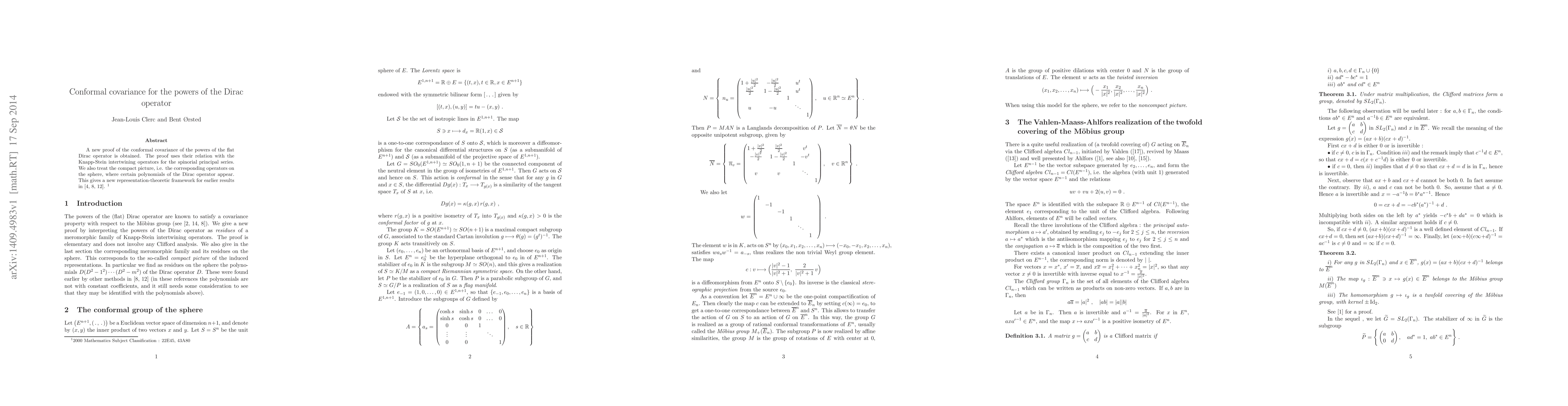 A new proof of the conformal covariance of the powers of the flat Dirac operator is obtained. The proof uses their relation with the Knapp-Stein intertwining operators for the spinorial principal series. We also treat the compact picture, i.e. the corresponding operators on the sphere, where certain polynomials of the Dirac operator appear. This gives a new representation-theoretic framework for earlier results.