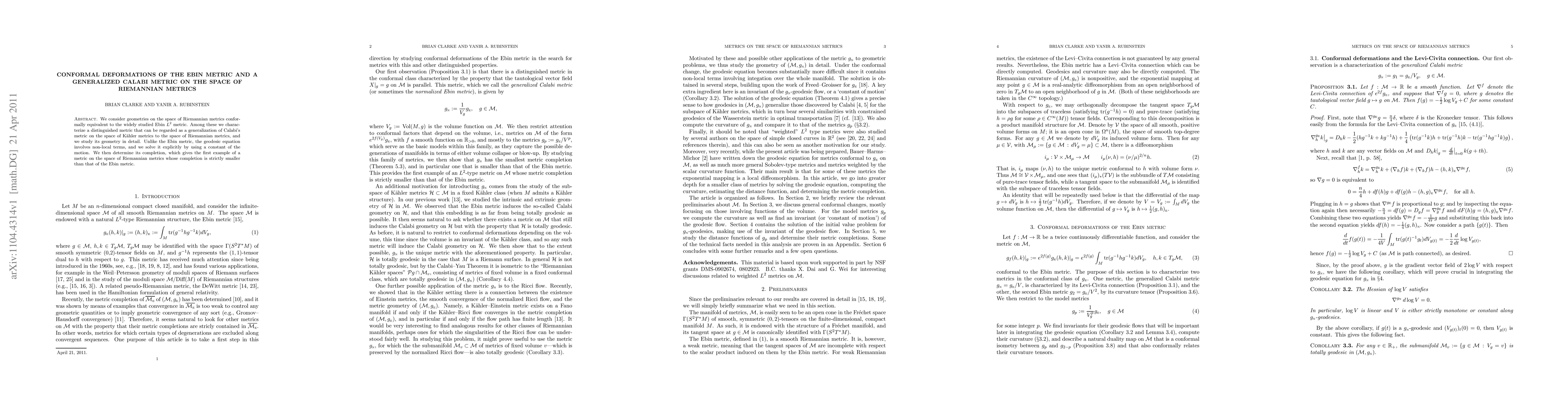 This paper explores conformal deformations of the Ebin metric on the space of Riemannian metrics, identifying a generalized Calabi metric with non-local geodesic equations. It solves these equations using a constant of motion and determines the completion of this new metric, which is smaller than the Ebin metric's completion.