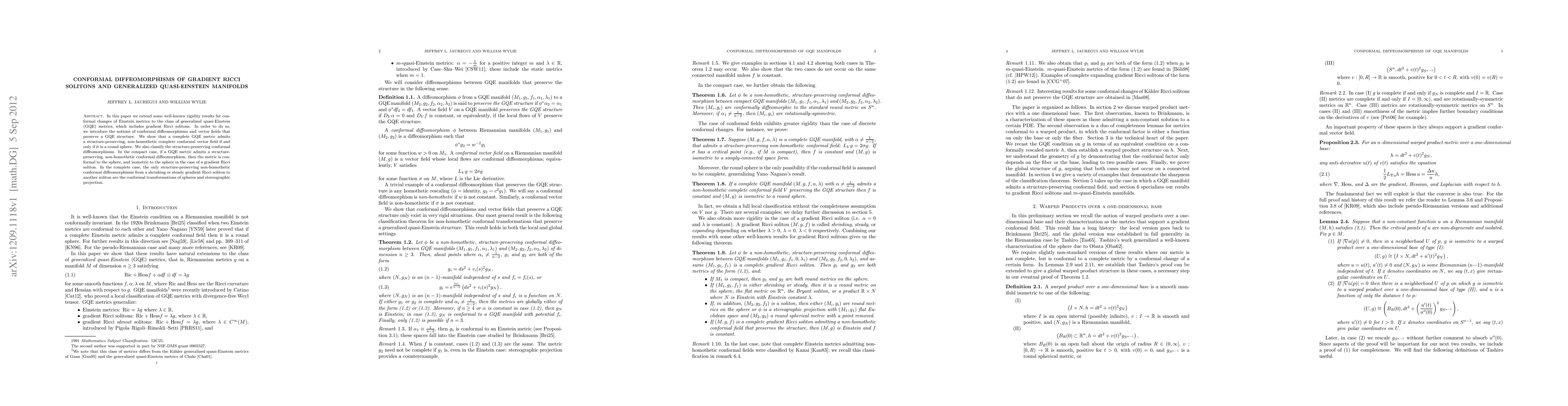 This paper extends rigidity results for conformal changes of Einstein metrics to generalized quasi-Einstein metrics, including gradient Ricci solitons, by introducing conformal diffeomorphisms and structure-preserving vector fields. It classifies conformal diffeomorphisms, showing that complete GQE metrics with non-homothetic conformal vector fields are round spheres.
