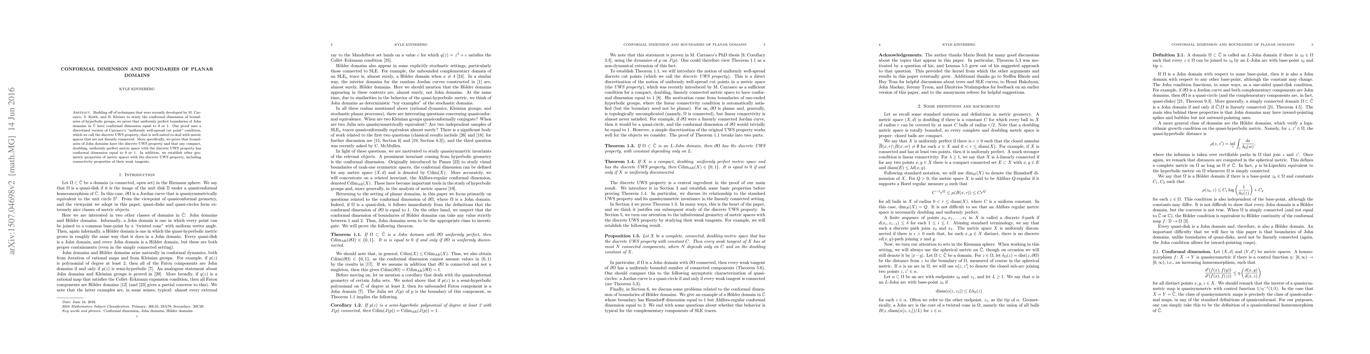 This paper proves that uniformly perfect boundaries of John domains in the Riemann sphere have conformal dimensions of either 0 or 1, using a discretized version of the "uniformly well-spread cut point" condition called the discrete UWS property. It also establishes geometric properties of metric spaces with this property, including connectivity properties of their weak tangents.
