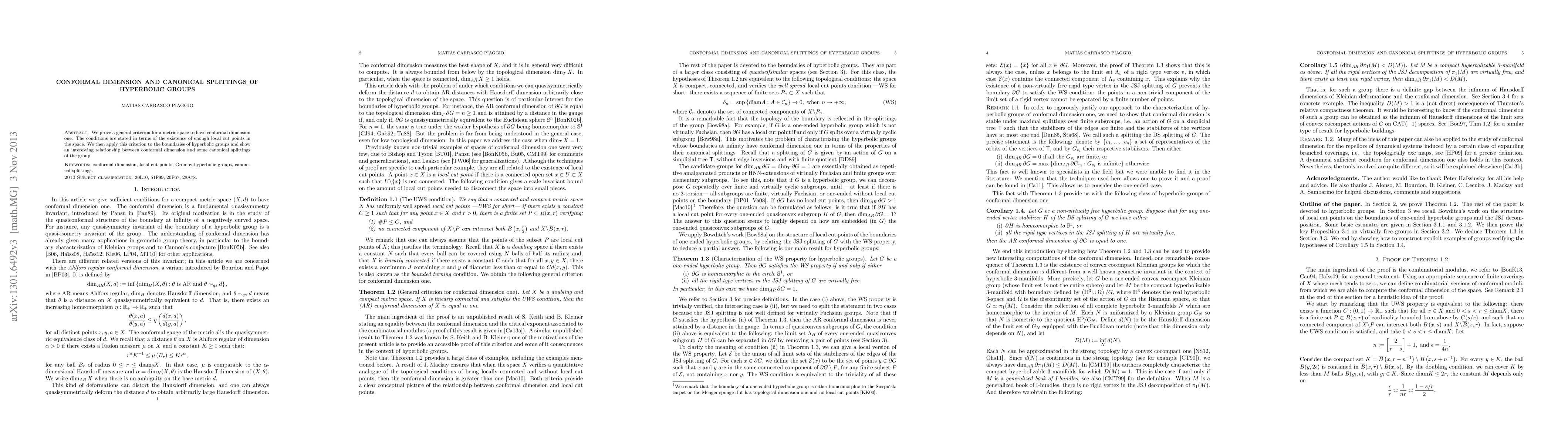 This paper establishes a criterion for metric spaces to have conformal dimension one based on local cut points, and applies this to hyperbolic groups to explore their relationship with canonical splittings. The study reveals an intriguing connection between conformal dimension and group structure.