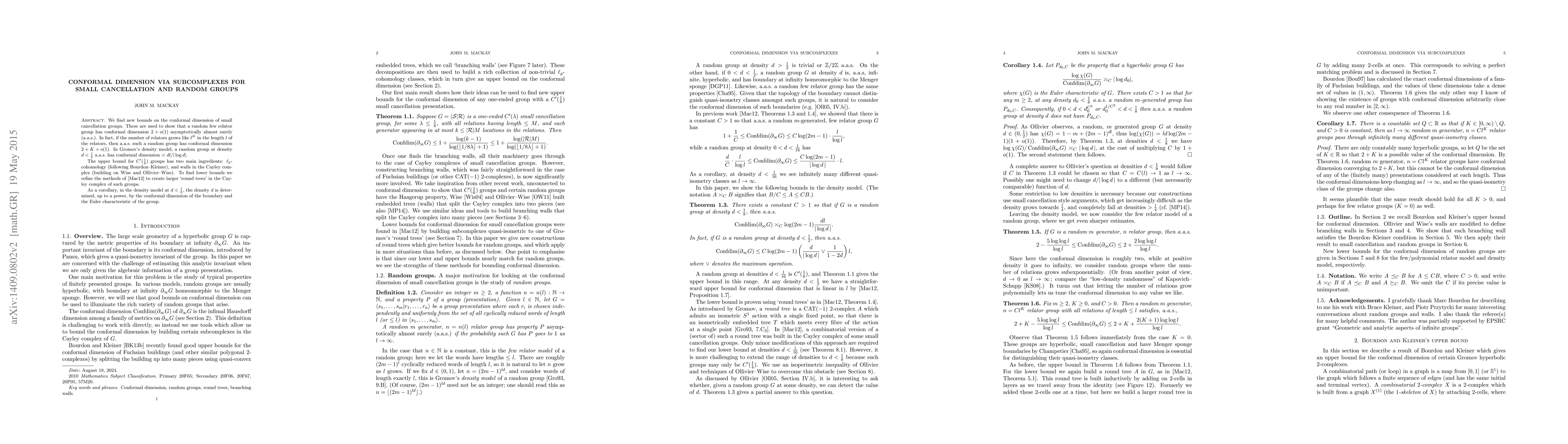 This paper establishes new bounds on the conformal dimension of small cancellation groups and demonstrates that random few relator groups have a conformal dimension of 2+o(1) asymptotically almost surely. It also shows that the conformal dimension depends on the number of relators, and in Gromov's density model, a random group at density d<1/8 has a conformal dimension proportional to dl/|log d|.