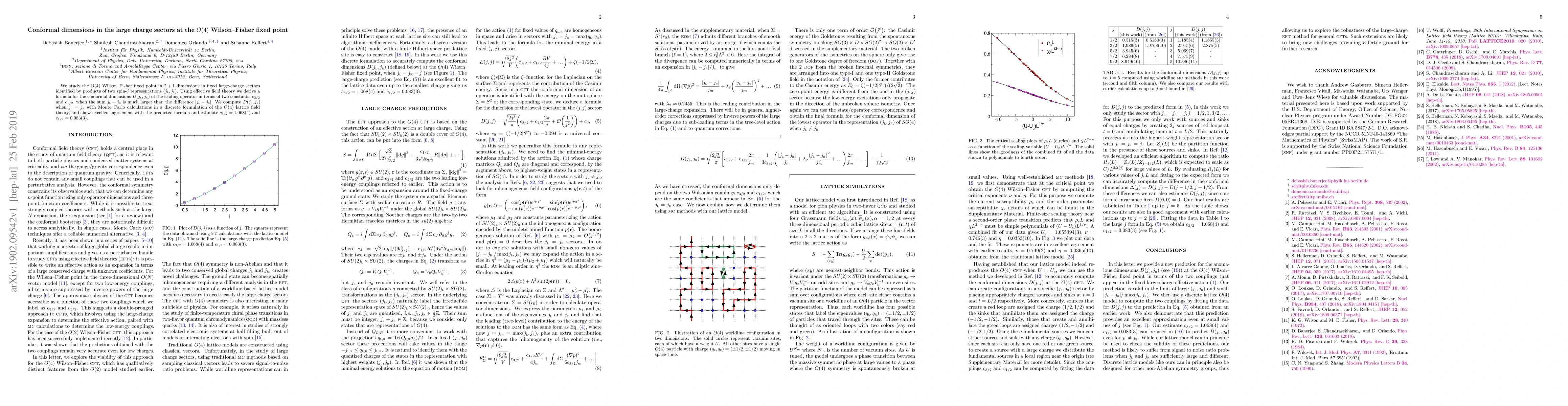 This paper derives a formula for conformal dimensions in large charge sectors at the O(4) Wilson-Fisher fixed point using effective field theory, and validates the formula with Monte Carlo calculations, estimating the constants $c_{3/2}$ and $c_{1/2}$ to be 1.068(4) and 0.083(3), respectively.