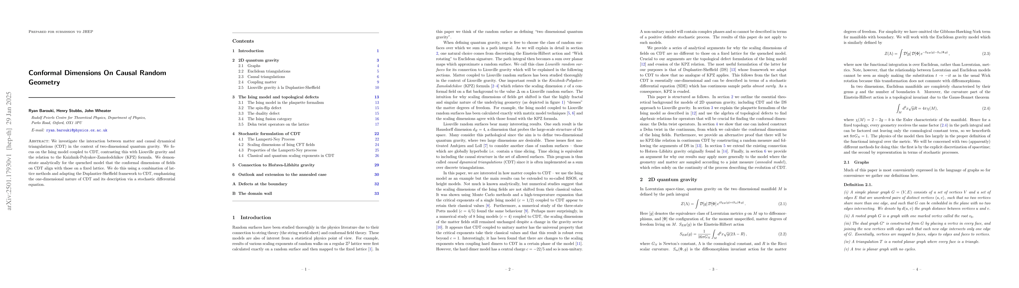 We investigate the interaction between matter and causal dynamical triangulations (CDT) in the context of two-dimensional quantum gravity. We focus on the Ising model coupled to CDT, contrasting this with Liouville gravity and the relation to the Knizhnik-Polyakov-Zamolodchikov (KPZ) formula. We demonstrate analytically for the quenched model that the conformal dimensions of fields on CDT align with those on a fixed lattice. We do this using a combination of lattice methods and adapting the Duplantier-Sheffield framework to CDT, emphasizing the one-dimensional nature of CDT and its description via a stochastic differential equation.