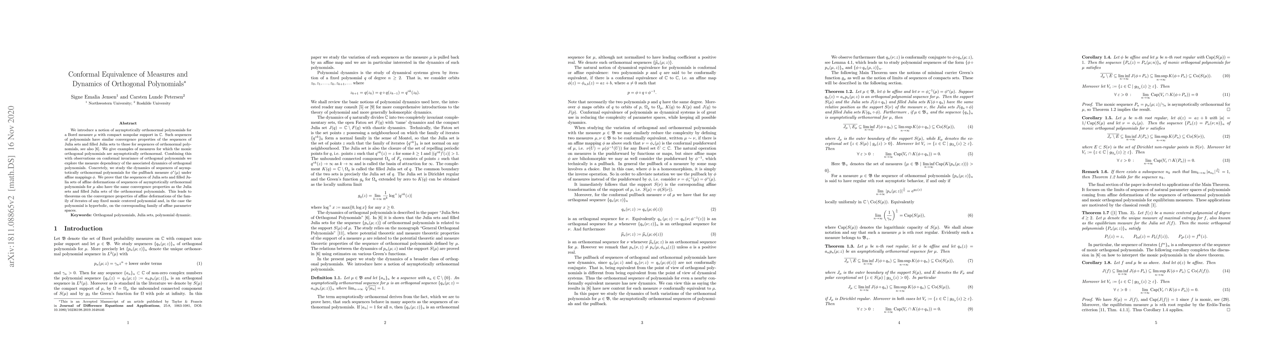 This paper explores the dynamics of orthogonal polynomials through the concept of asymptotically orthonormal polynomials for a Borel measure, demonstrating their convergence properties akin to those of Julia sets. It establishes conformal equivalence of measures and dynamics, proving that affine deformations maintain the same convergence properties.