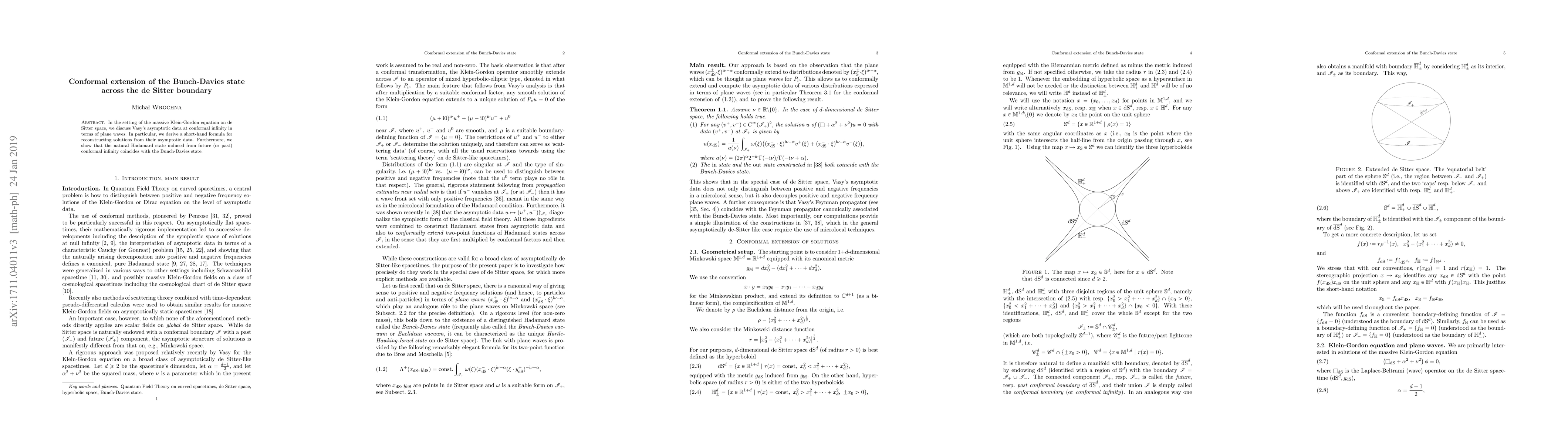 In the setting of the massive Klein-Gordon equation on de Sitter space, we discuss Vasy's asymptotic data at conformal infinity in terms of plane waves. In particular, we derive a short-hand formula for reconstructing solutions from their asymptotic data. Furthermore, we show that the natural Hadamard state induced from future (or past) conformal infinity coincides with the Bunch-Davies state.
