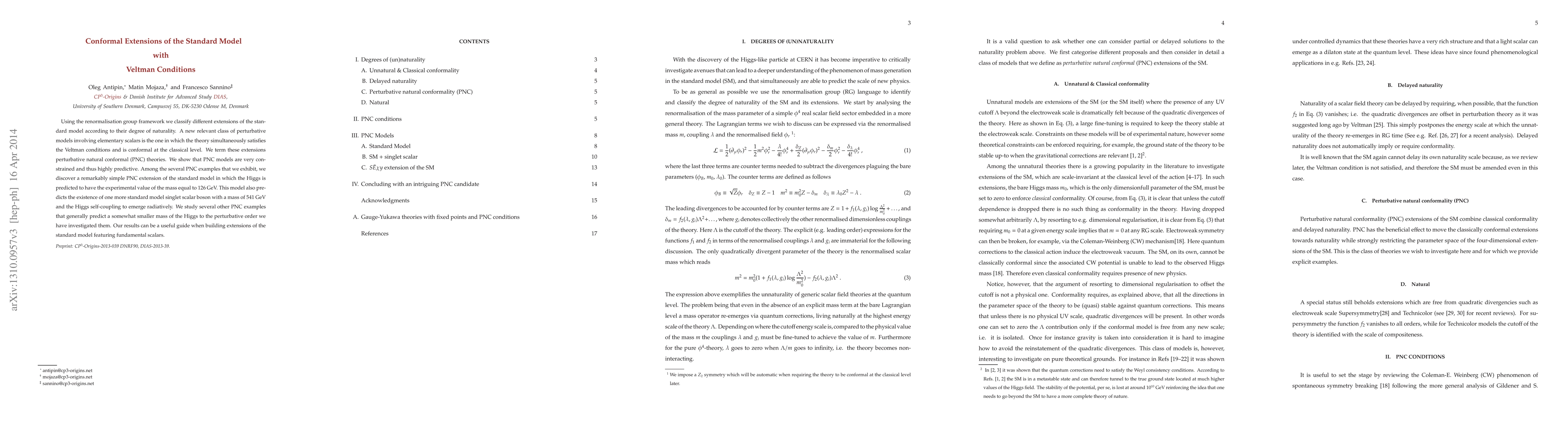 This paper classifies extensions of the Standard Model that satisfy Veltman conditions and are conformal at the classical level, termed perturbative natural conformal (PNC) theories. It finds that PNC models are highly predictive and predict a Higgs mass of 126 GeV, along with a new scalar boson at 541 GeV and a radiatively generated Higgs self-coupling.