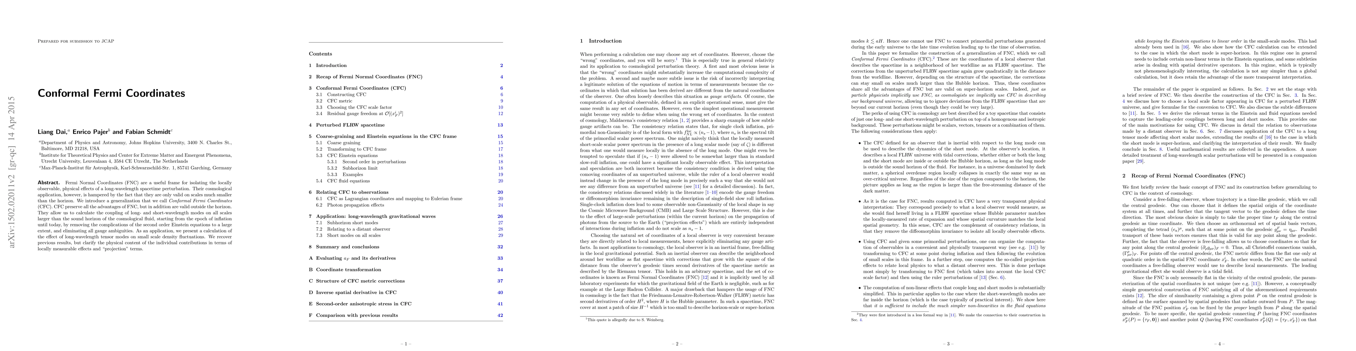Fermi Normal Coordinates (FNC) are a useful frame for isolating the locally observable, physical effects of a long-wavelength spacetime perturbation. Their cosmological application, however, is hampered by the fact that they are only valid on scales much smaller than the horizon. We introduce a generalization that we call Conformal Fermi Coordinates (CFC). CFC preserve all the advantages of FNC, but in addition are valid outside the horizon. They allow us to calculate the coupling of long- and short-wavelength modes on all scales larger than the sound horizon of the cosmological fluid, starting from the epoch of inflation until today, by removing the complications of the second order Einstein equations to a large extent, and eliminating all gauge ambiguities. As an application, we present a calculation of the effect of long-wavelength tensor modes on small scale density fluctuations. We recover previous results, but clarify the physical content of the individual contributions in terms of locally measurable effects and "projection" terms.
