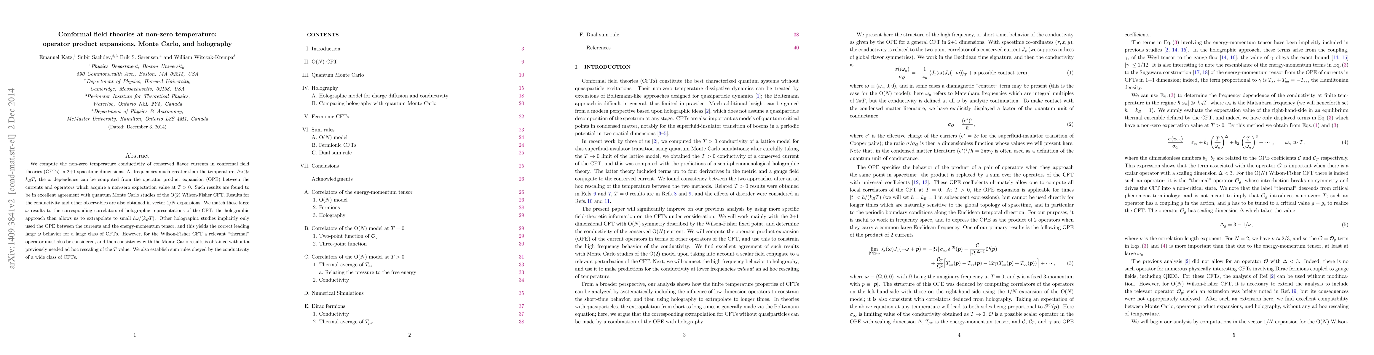 This paper investigates the non-zero temperature conductivity of conserved flavor currents in 2+1 dimensional CFTs, using operator product expansions, Monte Carlo simulations, and holography. It finds excellent agreement between OPE results and Monte Carlo studies for the O(2) Wilson-Fisher CFT, and establishes sum rules for the conductivity across a broad class of CFTs.